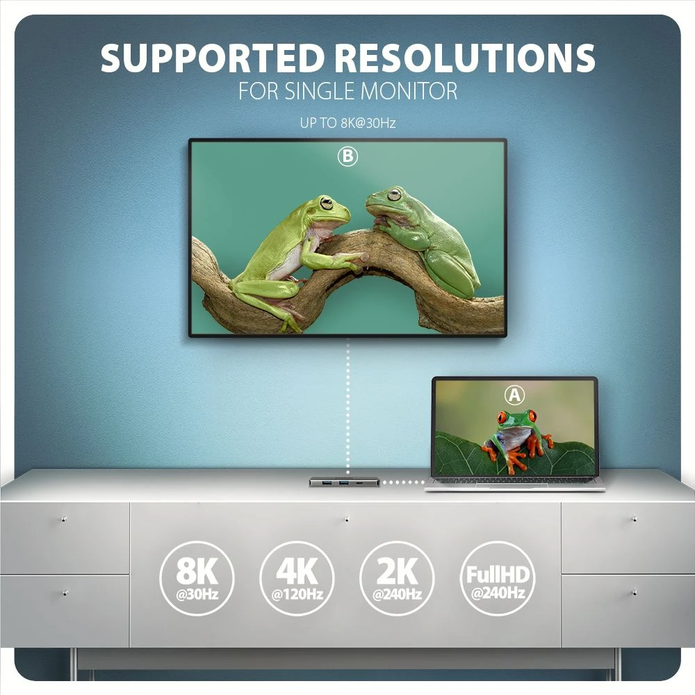 A HDMI kimenet kiváló minőségű képet biztosít akár 8K/30Hz és 4K/120Hz Ultra HD HD felbontásig, támogatja a többcsatornás audioátvitelt. A népszerű játékfelbontások 2K/240Hz vagy FullHD/240Hz és 144Hz magas frekvenciái szintén támogatottak. A HDR (high dynamic range) támogatásnak köszönhetően jelentősen kibővült szín- és kontrasztválasztékot élvezhet korlátozások nélkül. A DisplayPort Alternate Mode (DP Alt Mode) engedélyezett USB-C port vagy Thunderbolt 3/4 port szükséges a videokimenet megfelelő működéséhez.