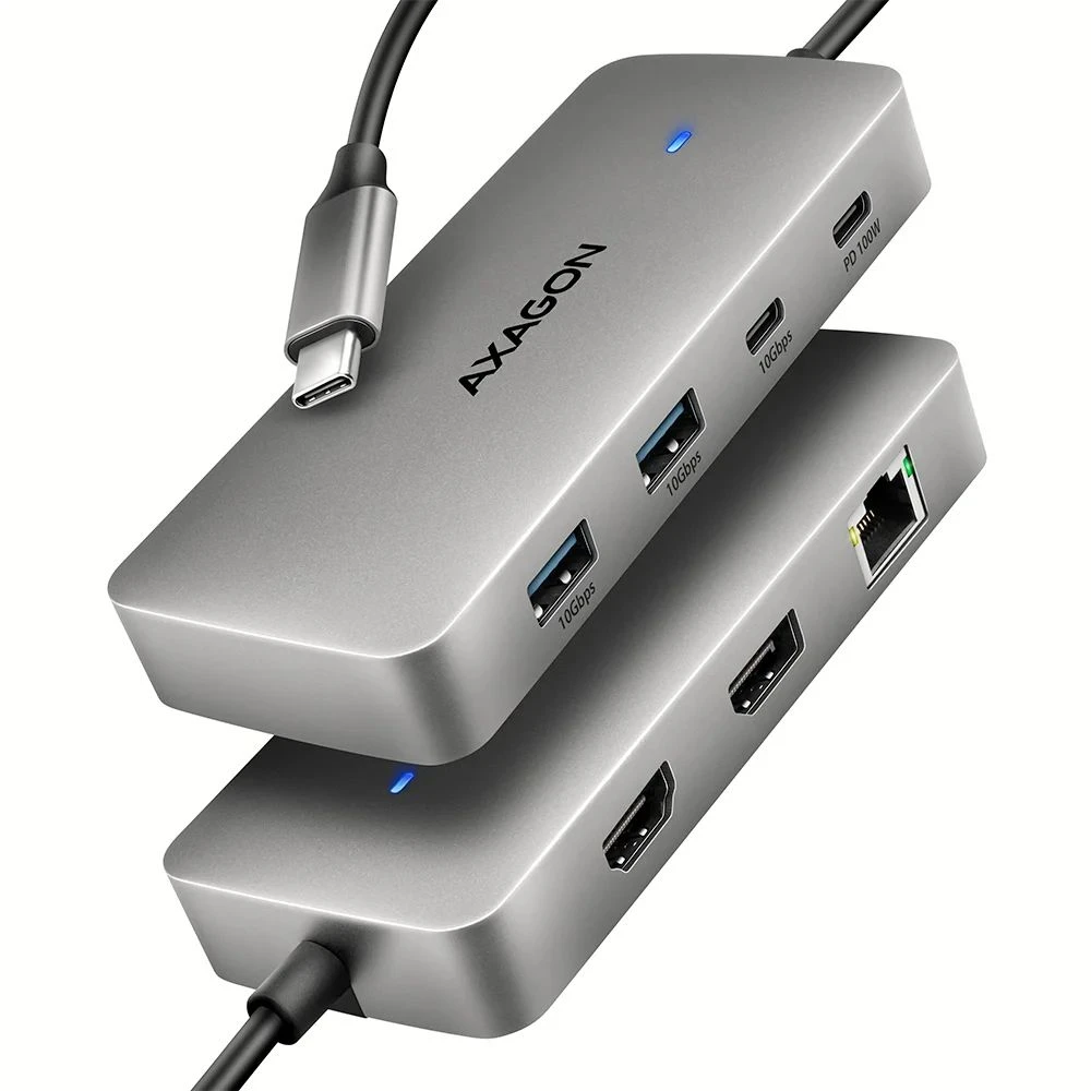 A többportos USB-C 10Gbps AXAGON HMC-CUB83X2 DUAL 4K DISPLAY 7in1 hub két video kimenettel, LAN csatlakozóval és USB portokkal bővíti a laptop, számítógépét vagy telefonját. A Laptop a 15 cm hosszú USB-C kábellel csatlakoztathatja a hubhoz. Így azonnal lehetősége nyílik két 4K monitor, három USB eszköz és egy RJ-45 csatlakozó használatára a Gigabites Ethernet hálózathoz. Egyidejűleg rendelkezésre áll a laptop tápellátása is a Power Delivery technológián keresztül. A Thunderbolt 3/4/5 kompatibilitás egy 7 az 1-ben dokkolóállomást biztosít olyan laptopkhoz, mint például az Apple MacBook Air vagy Pro.