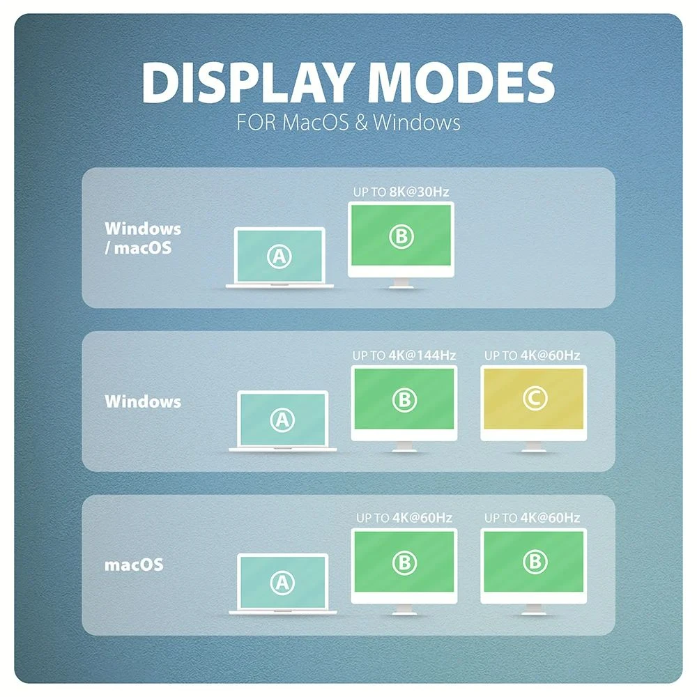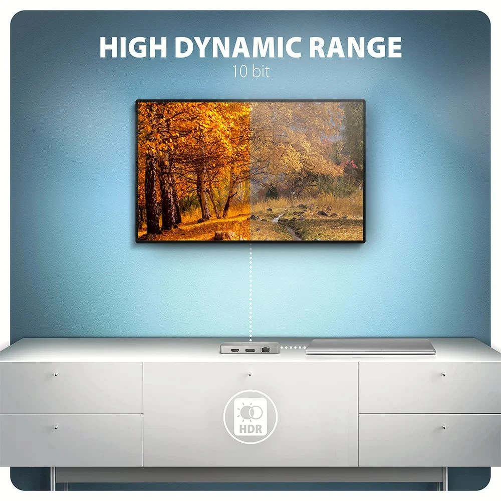A dokkolóállomás két video kimenetet kínál a HDMI és a DisplayPort lehetővé teszi külső monitorok, televíziók vagy projektorok csatlakoztatását akár 8K/30Hz Ultra HD felbontásig. Más népszerű felbontások, például 4K/144Hz Ultra HD, 2K/240Hz Quad HD vagy 1080p/240Hz Full HD valamint a többcsatornás audio streaming is támogatott. Két monitor egyidejű csatlakoztatásakor mindkettőn 4K/60Hz felbontást biztosít. A HDR (High Dynamic Range) támogatásnak köszönhetően a felhasználók jelentősen szélesebb színtartományt és nagyobb kontrasztot élvezhetnek, amit munkához és szórakozáshoz egyaránt értékelnek.