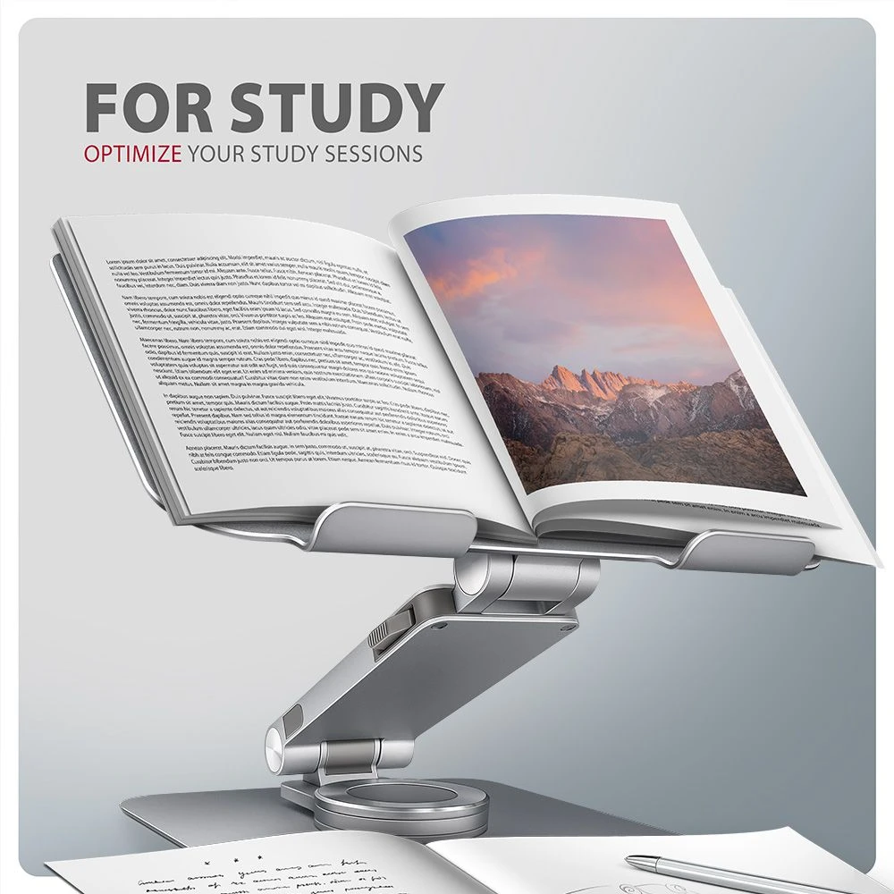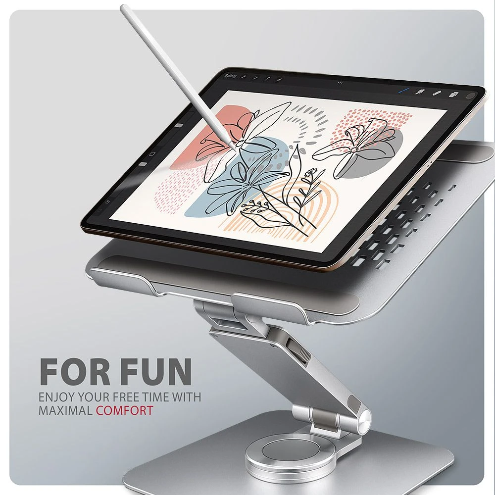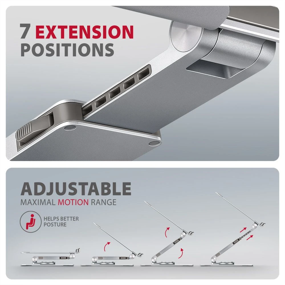 A 360°-os mechanizmus lehetővé teszi, hogy a laptop teljes karja a tengelye körül forogjon. Ez a funkció maximális rugalmasságot biztosít könnyedén megváltoztathatja laptopja tájolását anélkül, hogy az állványt el kellene mozgatnia. Ezt különösen akkor fogja értékelni, ha szűk helyeken dolgozik, vagy amikor megosztja laptopja képernyőjét üzleti találkozók, tájékoztatók vagy prezentációk során.