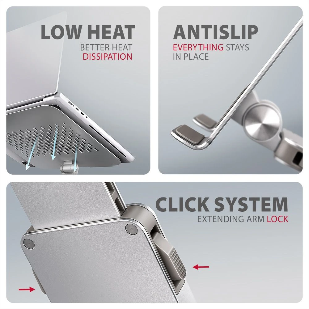 A laptopállvány robusztus alumíniumöntvényekből készült, amelyek hosszú élettartamot és megbízhatóságot garantálnak. A csúszásmentes kezelésnek köszönhetően készüléke biztonságosan a helyén marad, nemkívánatos mozgások veszélye nélkül, anélkül, hogy kárt okozna a laptop felületében vagy a padban. Ezek a gondosan megtervezett funkciók tökéletes stabilitást biztosítanak laptopja, táblagépe vagy kedvenc könyve számára, így nyugalmat és kényelmet biztosítanak a mindennapi használat során.