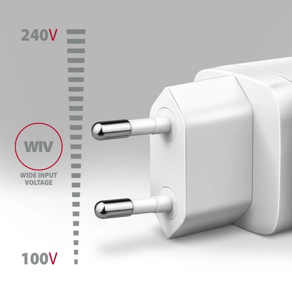 Töltő adapter készülékháza kellemes formájú és kompakt méretű. A kis méretek és a bemeneti feszültségek széles skálájának kombinációja a töltőt ideális utazási segédeszközzé teszi.