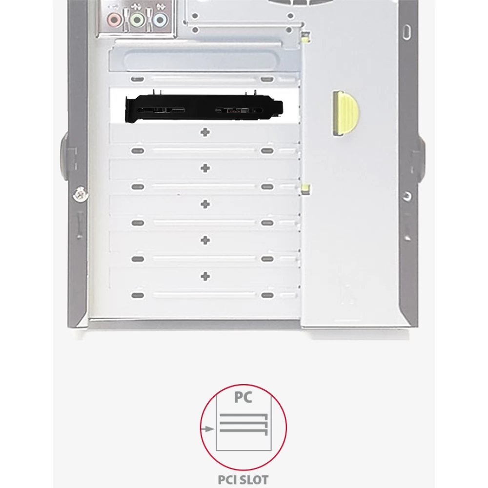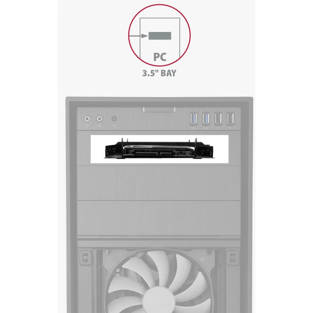 A precíz furatok és a mellékelt csavarok biztosítják a keretek egyszerű és problémamentes beépítését a számítógép házába. Az adapter egy univerzális kiegészítő, mivel PCI és 3.5" pozíciókba is lehet meghajtókat tenni. A lemezhűtés fokozása érdekében a keretre egy extra ventilátort lehet felszerelni.