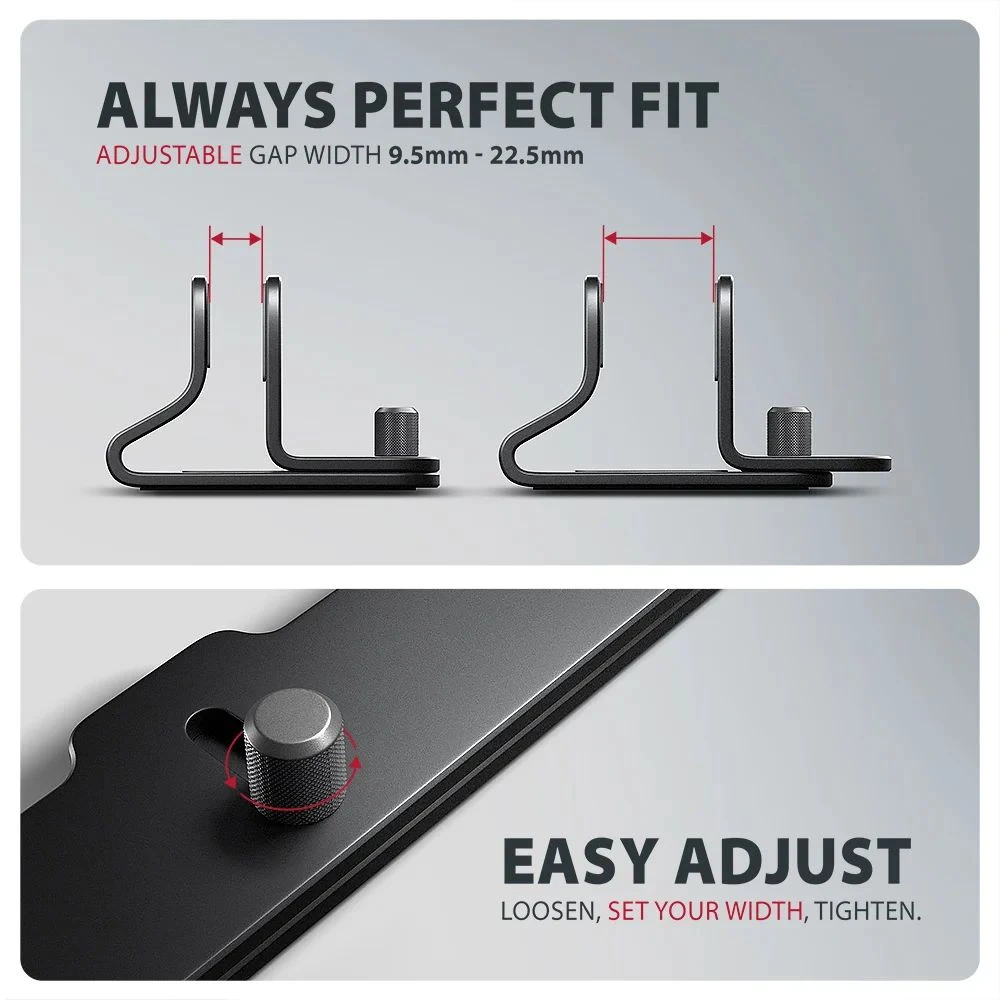 Előny a 9,5 mm és 25,5 mm között állítható résszélesség, amely lehetővé teszi a legtöbb laptop egyszerű behelyezését. A beállított szélességet egy recézett állítócsavar rögzíti biztonságosan, amely szilárdan rögzíti az állványt a kívánt helyzetben.
