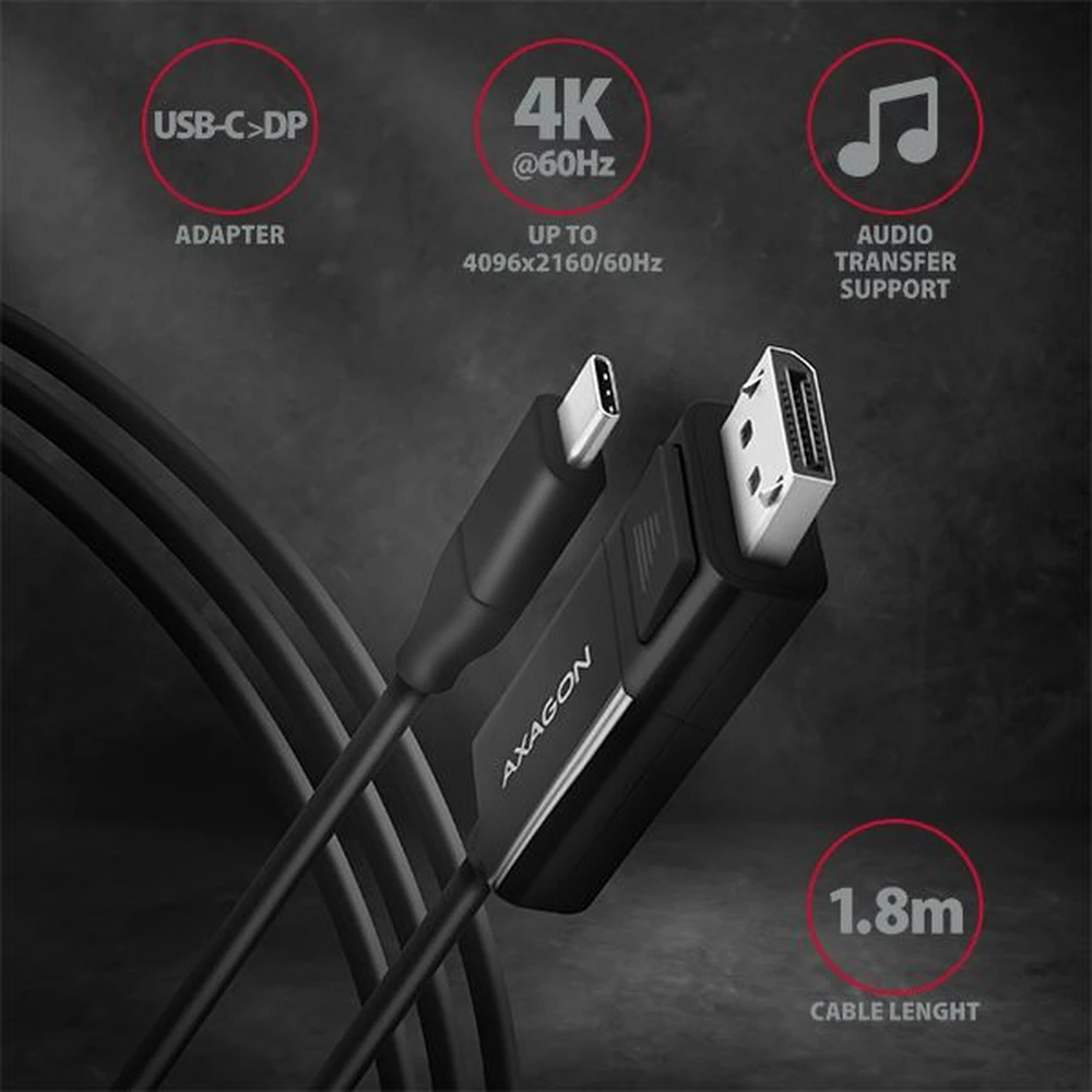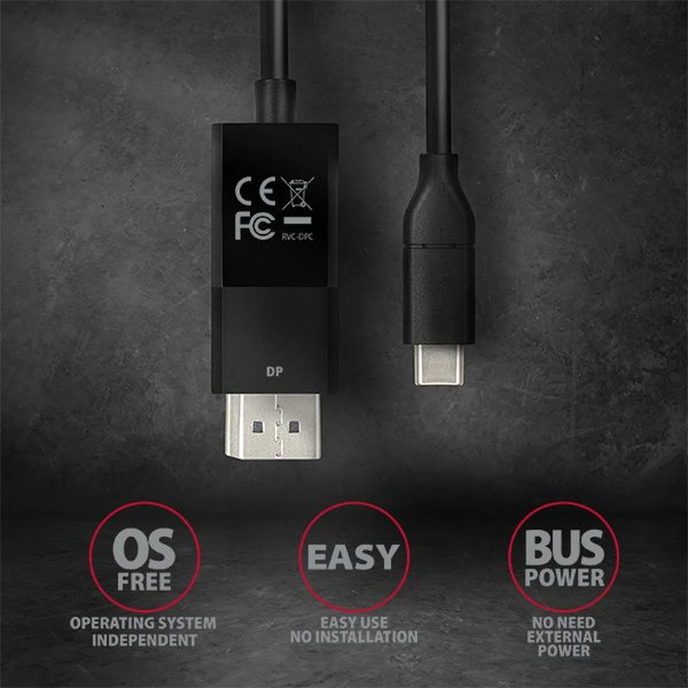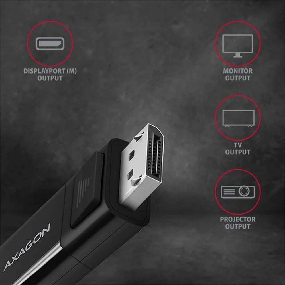 Aktív USB-C -> DisplayPort AXAGON RVC-DPC kábel - adapter, DisplayPort monitor/TV/kivetítő laptophoz vagy telefonhoz való csatlakoztatásához az USB-C csatlakozón keresztül.