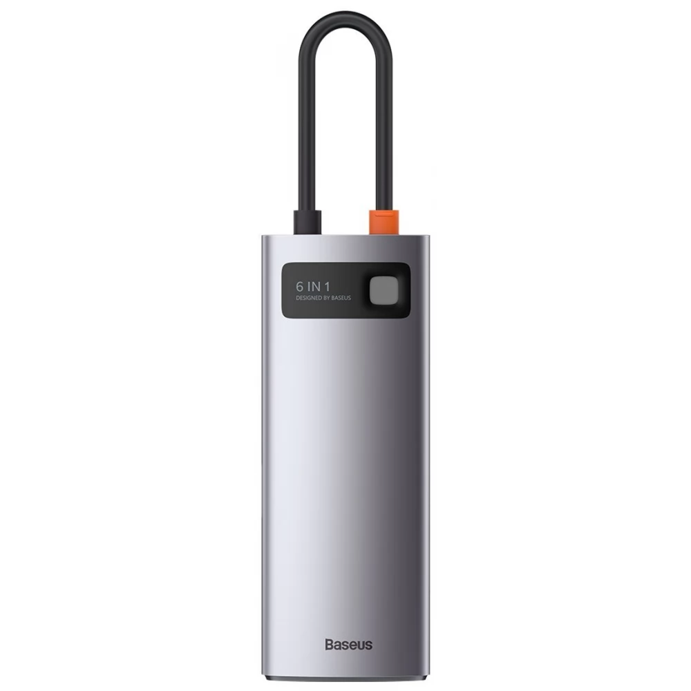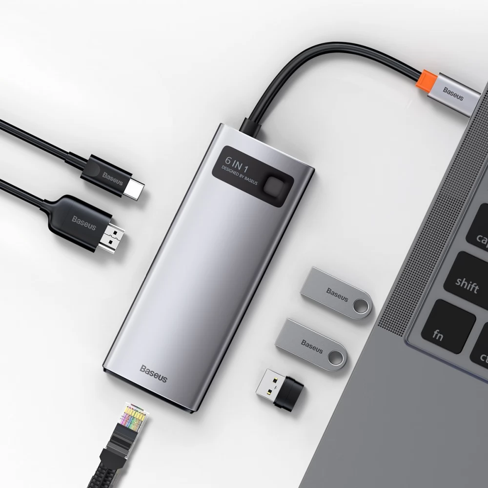 A BASEUS Metal Gleam Series 6 az 1-ben hub USB-C csatlakozóval bővíti notebookja lehetőségeit. Három USB 3.0 port, HDMI kimenet, USB-C PD töltés és Ethernet RJ45 csatlakozó biztosítja a sokoldalú használatot. Ezüst színű, kompakt kialakítású port bővítő mindennapi munkavégzéshez.