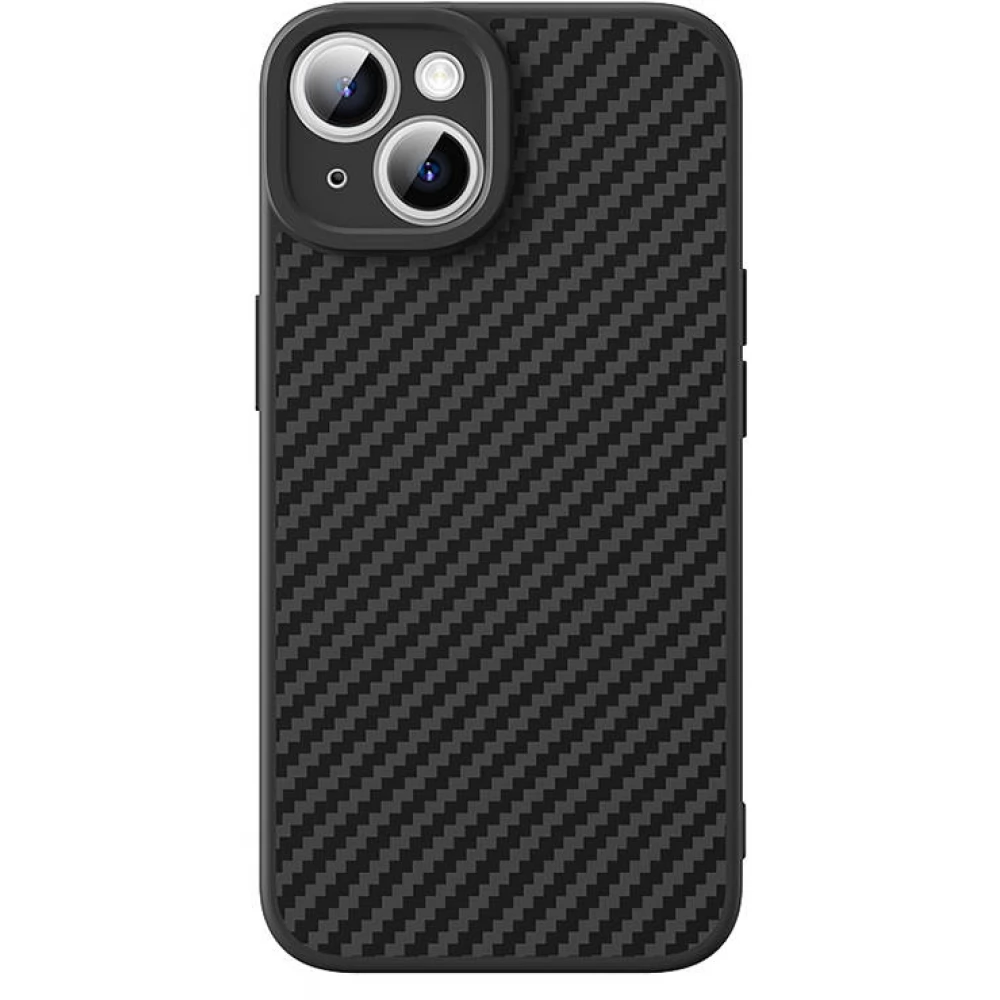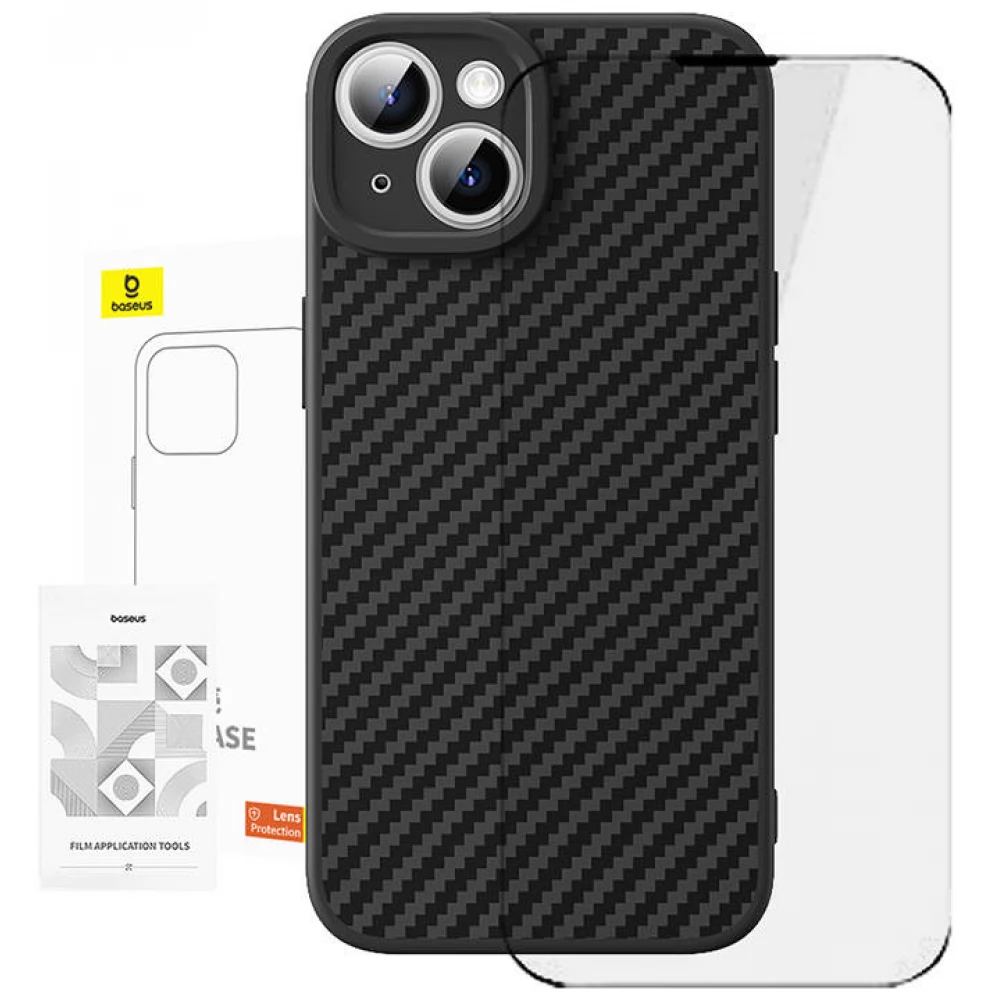BASEUS Synthetic Fiber hátlaptok + edzett üveg iPhone 15 Plus fekete