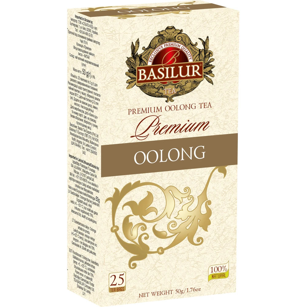 Basilur Premium Oolong tea. A legnagyobb szakértelmet igénylő tea típus. Az Oolong vagy Wulong kifejezés, “fekete sárkányt” jelent kínaiul. A hosszúkásra sodort levelek formája és színvilága egy sötét “szellem” sárkányra emlékezteti a kínaiakat.