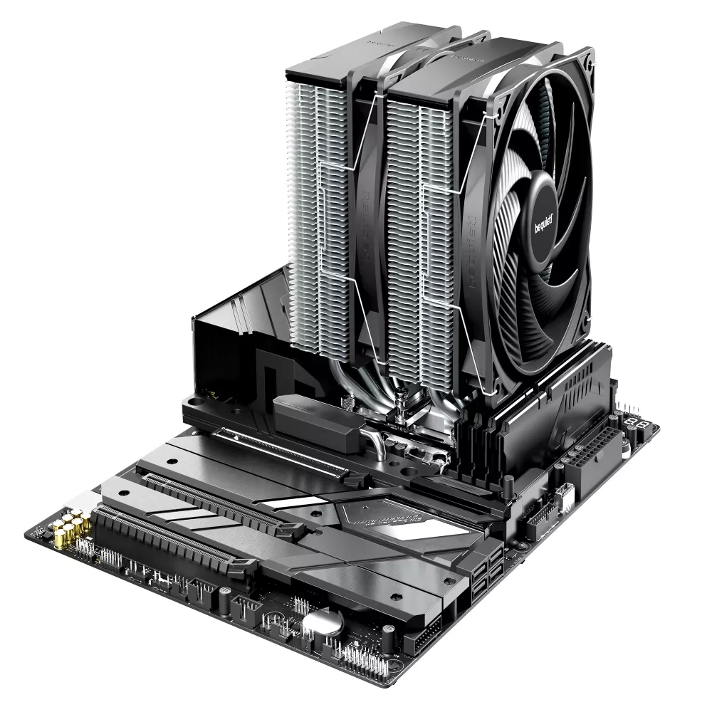 Duplatornyos kivitele ellenére a Pure Rock Pro 3 léghűtés kompakt, eltolt felépítése jelentősen megnöveli a RAM és VRM hűtőkkel való kompatibilitást. Az első ventilátor magassága szükség esetén állítható.