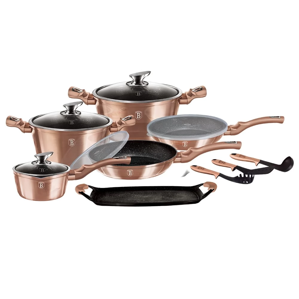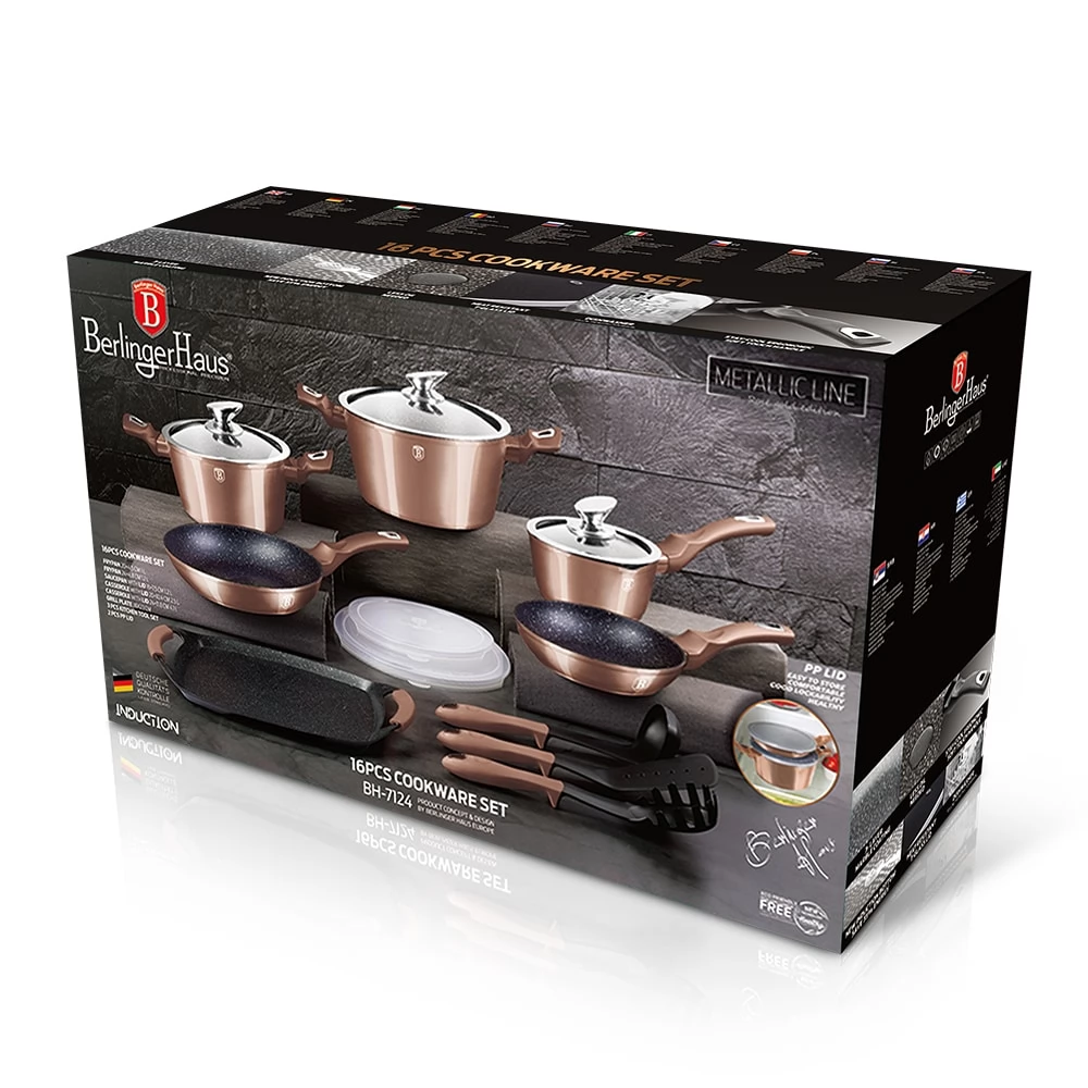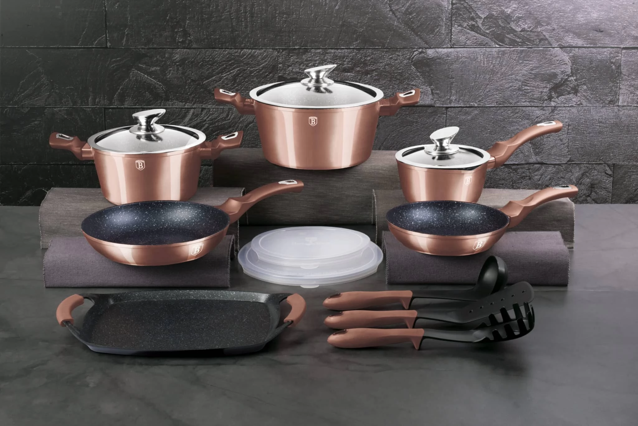 A BerlingerHaus Metallic Line Rose Gold Edition 14+2 részes edénykészlet a modern és elegáns konyhák tökéletes kiegészítője. A kovácsolt alumíniumból készült edények erős és tartós anyagból készültek, amelyek egyenletes hőeloszlást biztosítanak. A rose gold színű metál bevonat eleganciát kölcsönöz a készletnek, amely a modern konyhák stílusához igazodik. A készlet 14 darab alap edényt tartalmaz, valamint 2 db műanyag fedőt is, amelyek tökéletes kiegészítői az edényeknek.