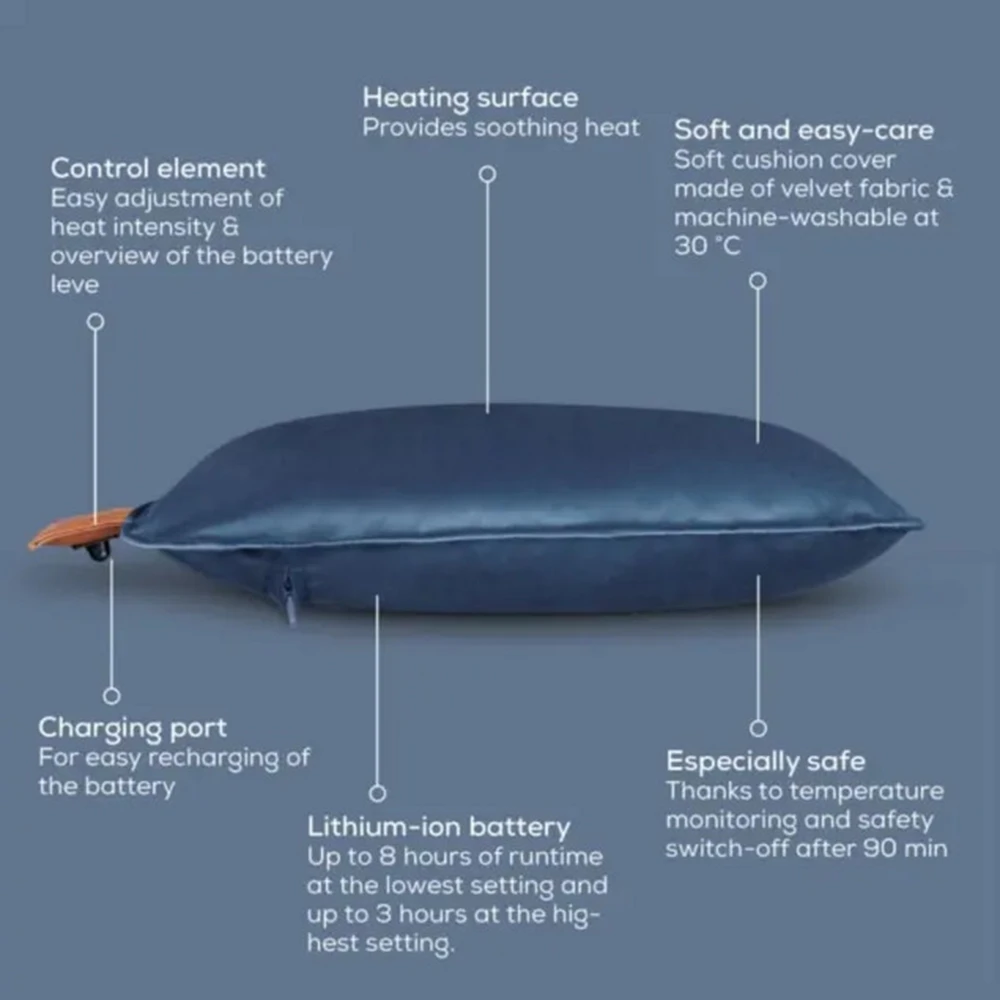 Biztonságos használatot garantál az automatikus kikapcsolási funkció és a hőmérséklet-felügyelet. A csere nélküli lítium-ion akkumulátor és a hálózati adapter a csomag részét képezi. A párnahuzat 30 °C-on mosógépben mosható, a belső párna nem mosható.