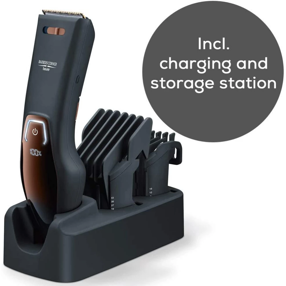 - Tartalmazza: Tisztító kefe, olló, fésű és olaj, töltő dokkoló