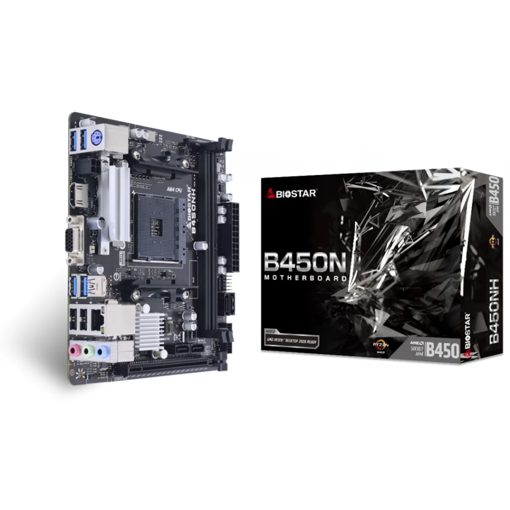 BIOSTAR B450NH Ver. 6.0 típusú alaplap Socket-AM4 foglalattal, AMD B450 chipsettel, Processzorban integrált videokártyával, 2 darab DDR4 memóriafoglalattal (max 64GB). 4 darab USB 2.0 port, 6 darab USB 3.0 port.