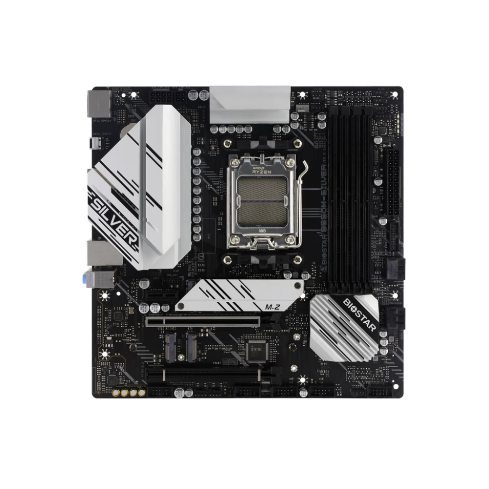 BIOSTAR B650M-SILVER Ver. 5.x típusú alaplap Socket-AM5 foglalattal, AMD B650 chipsettel, Processzorban integrált videokártyával, 4 darab DDR5 memóriafoglalattal (max 192GB). 6 darab USB 2.0 port, 2 darab USB 3.0 port, 3 darab USB 3.1 port.