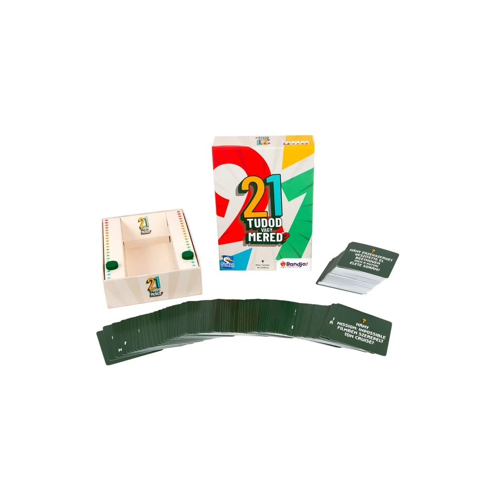 A 21 – Tudod vagy mered? egy könnyen tanulható, izgalmas társasjáték, amelynek az alapja a blackjack (vagy más néven 21) világát idéző pontvadászat, de itt a kártyákon kérdések vannak, a válaszok pedig tippeléssel születnek.