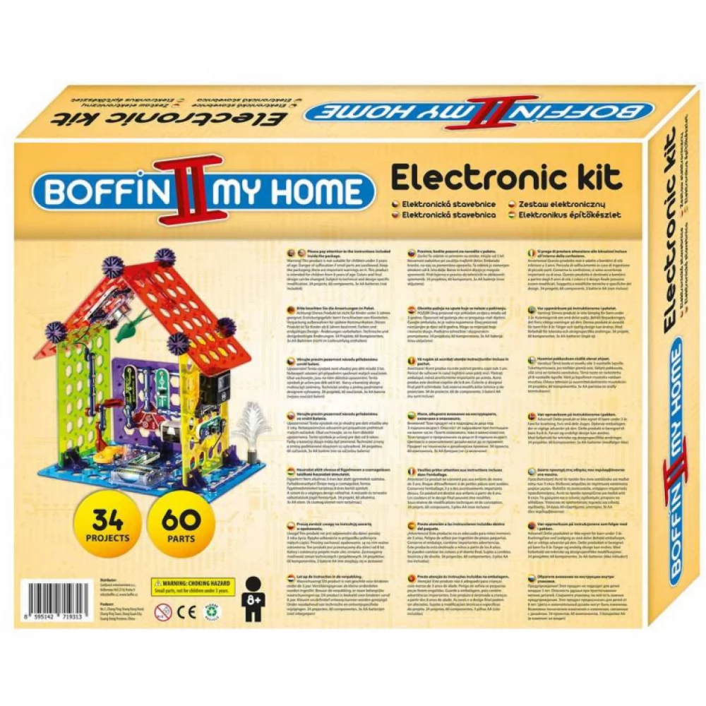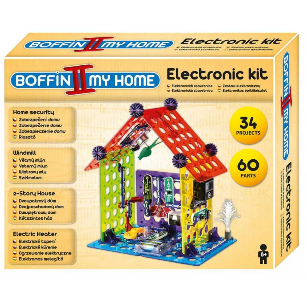 Boffin II MY HOME építőkészlettel megtuják, hogyan érkezik az áram a házba, fényérzékelőt, elektromos melegítőt, emeletes házat, szélmalot és más projekteket. Az építőkészlet 60 db komponenst tartalmaz, melyekből a következő projekteket készíthetjük el:
