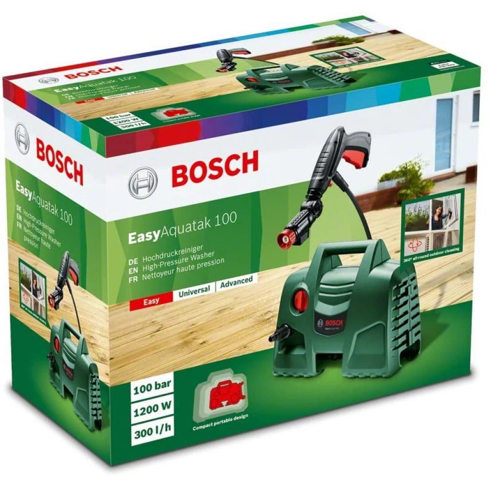 Ez a magasnyomású mosó praktikus megoldást nyújt a szennyezett felületek rendszeres tisztításához. A Bosch 360°-os szórópisztollyal egyszerűen tisztíthatók a nehezen hozzáférhető helyek. Az egykezes működtetés nagyobb szabadságot és kezelhetőséget nyújt a gyorsabb eredmények érdekében. Emellett a lapos vízsugár erőssége a feladatnak megfelelően az erőteljes sugártól a finom öblítésig állítható. Az EasyAquatak 100 használható autók, szemeteskukák, kerti bútorok és ablakok tisztítására. Magasnyomású tisztítószer-adagoló fúvókával is rendelkezik, amely a vízsugárral együtt adagolja a tisztítószert az alapos tisztítás érdekében.