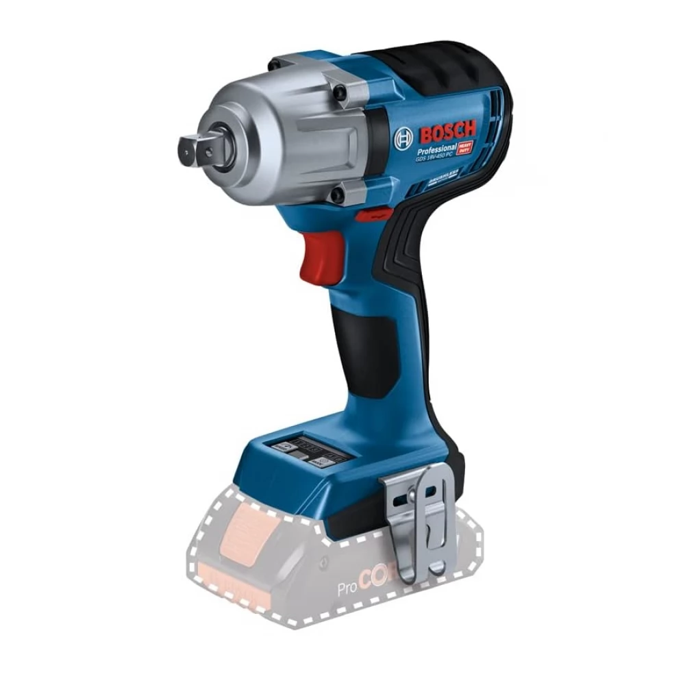 A GDS 18V-450 PC rögzítőcsapos befogással, állapotjelzővel, LED-lámpával és övcsipesszel rendelkezik a kényelmesebb munkavégzés érdekében.