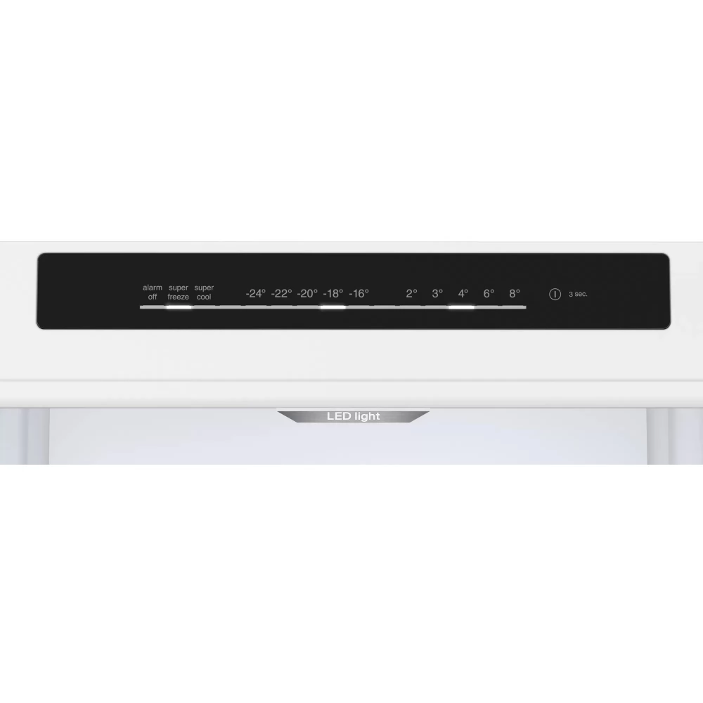 - Kezelő- és jelzőelemek: Fagyasztó hőmérséklet kijelzése, Fagyasztó super fokozat, Fagyasztótér figyelmeztető, Hangjelzés: ajtó nyitva, Hangjelzés hiba esetén, Hűtő hőmérséklet kijelzése, Hűtő super fokozat