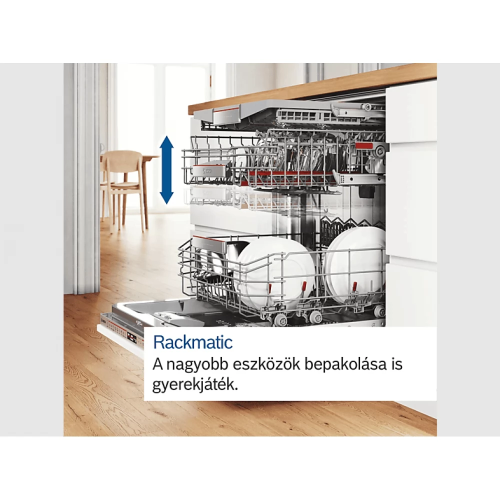 A hármas RackMatic rendszernek köszönhetően a felső kosár magassága akár 5 cm-rel könnyen állítható. És akkor is megteheti, ha teljesen meg van töltve. Ez még több beállítási lehetőséget és ezáltal a maximális rugalmasságot jelenti.