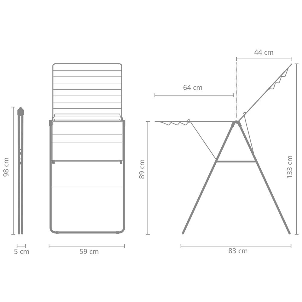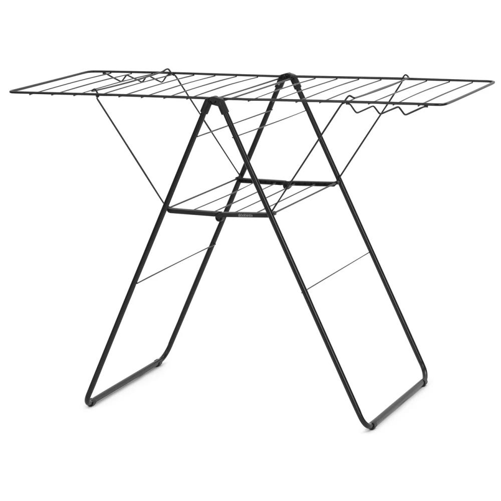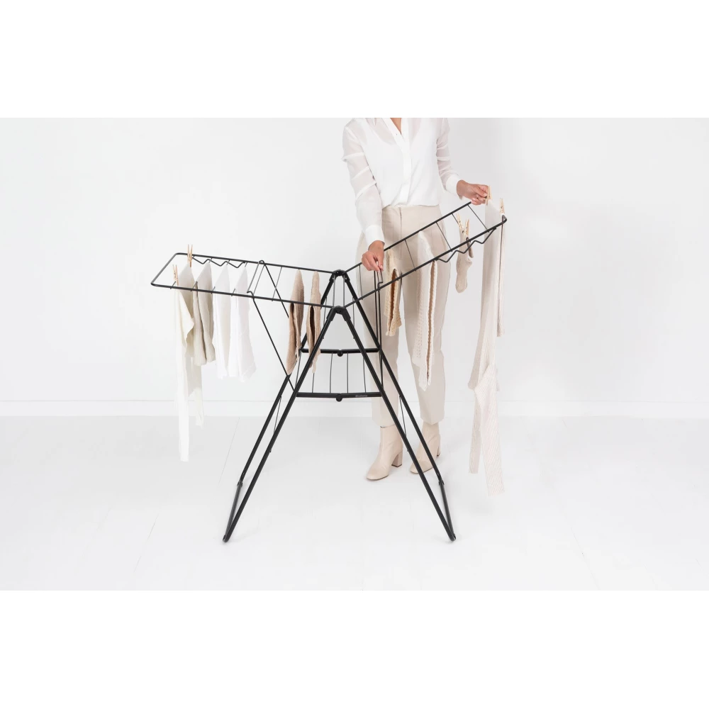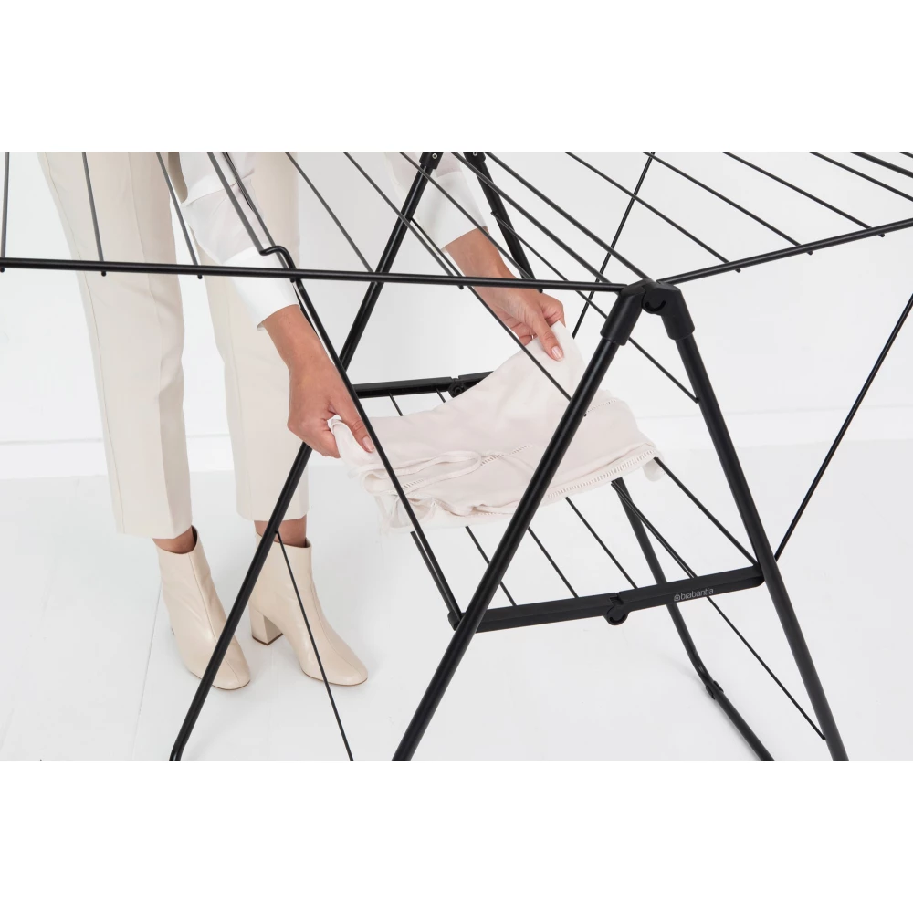 A teljes felület vízszintes állásba kinyitható, így ideális nagyméretű, kényes textíliák gyűrődésmentes szárítására is. Amikor nincs használatban, egyszerűen összehajtható és a beépített szállítási zárnak köszönhetően könnyen mozgatható. Összecsukott állapotban minimális helyet foglal, ami különösen értékes tulajdonság kisebb lakóterekben.