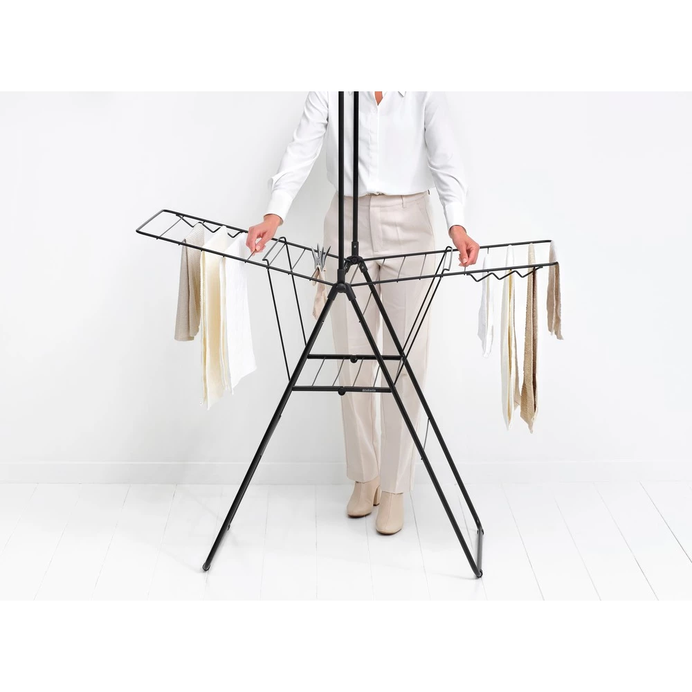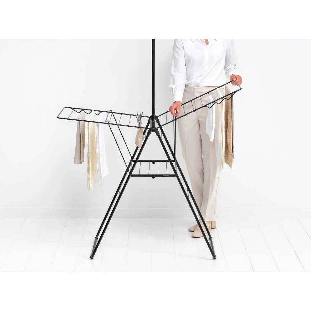 BRABANTIA HangOn Drying Rack ruhaszárító állvány. 20m szárítási hossz. felhajtható vállfa tartórúddal. 6db ruhaakasztó kampó. 12+10kg teherbírás. összecsukható. acél. matt fekete - 403620