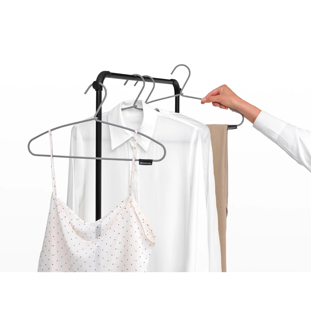 A Brabantia HangOn ruhaszárító állvány praktikus megoldást kínál a mosott ruhák szárítására 20 méteres szárítófelületével. Modern matt fekete kivitelben, összecsukható kialakítással és felhajtható vállfa tartórúddal rendelkezik, amely akár 10 vállfának is helyet biztosít. Stabil, teherbíró szerkezete és kompakt tárolhatósága minden otthon számára ideális választás.