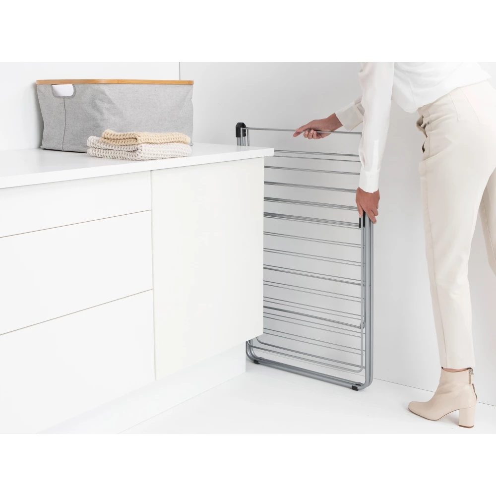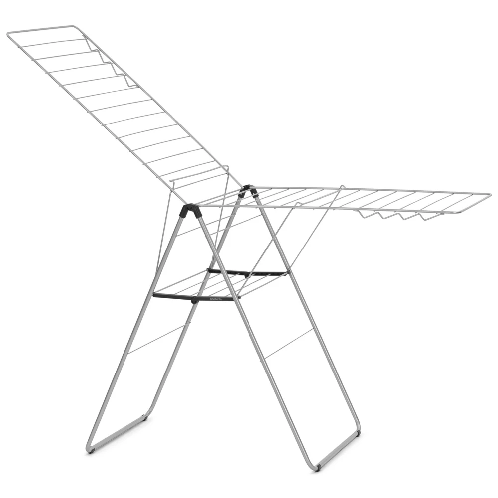 A metál szürke Brabantia HangOn ruhaszárító állvány 25 méteres szárítási hosszával és 12,5 kg teherbírásával ideális megoldás a mindennapi ruhaszárításhoz. Fenntartható anyagokból készült, állítható szárnyakkal és 8 akasztóhellyel rendelkezik, így minden típusú ruhadarab számára megfelelő helyet biztosít.