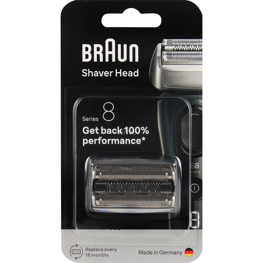 A Braun Series 8 borotvafejhez tartozó 83M kombicsomag, amely négy tökéletesen szinkronizált borotvaelemet tartalmaz ezüst színben. A borotvafej 18 hónap után történő cseréje ajánlott az optimális borotválkozási élmény fenntartása érdekében.