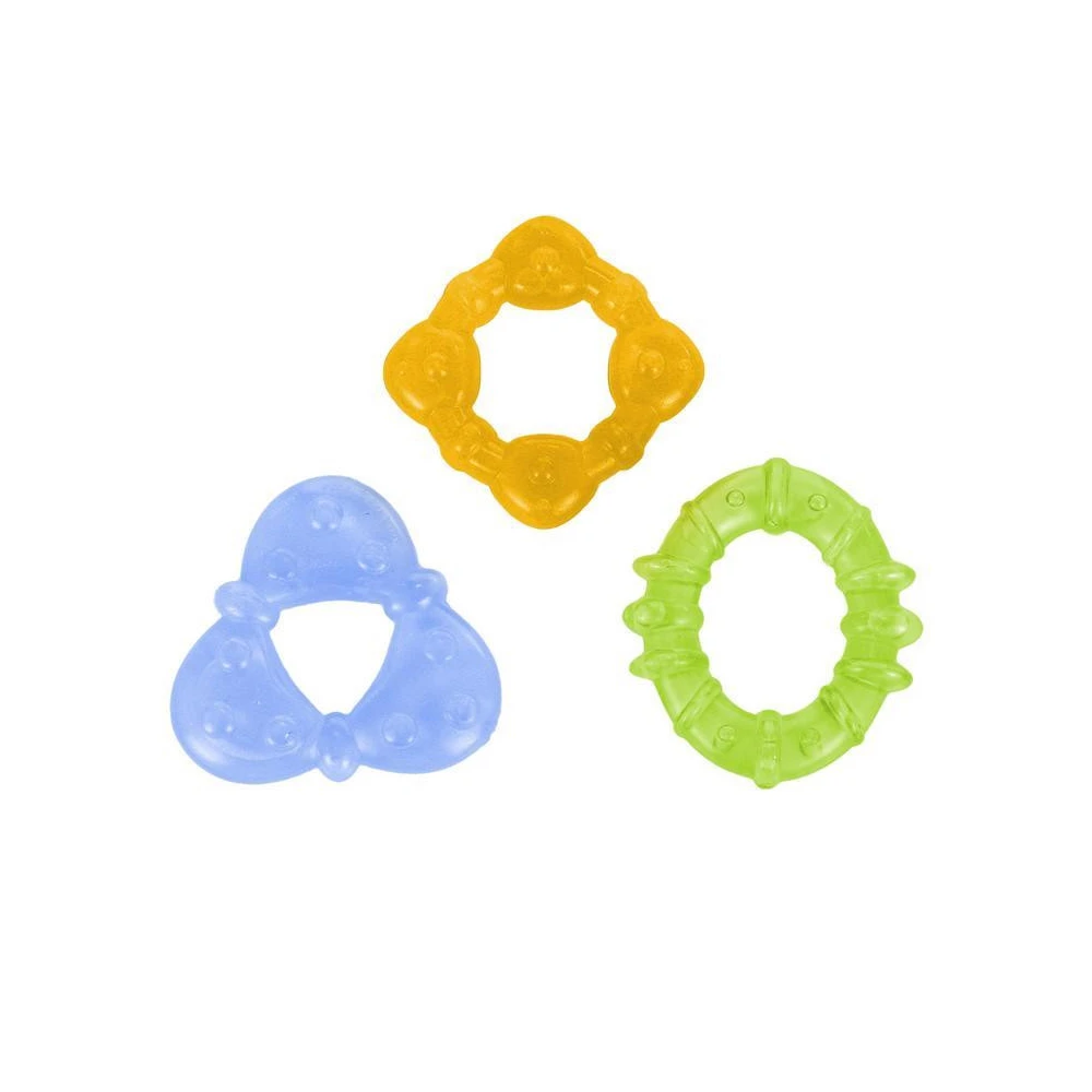 A három különböző formájú, hűtőben lehűthető rágóka, megnyugtatja babád ínyét. A lekerekített formák és a speciálisan kiválasztott színek segítenek gyermekednek gyakorolni a fogást, átvenni tárgyakat egyik kézből a másikba és megismerni a színeket.