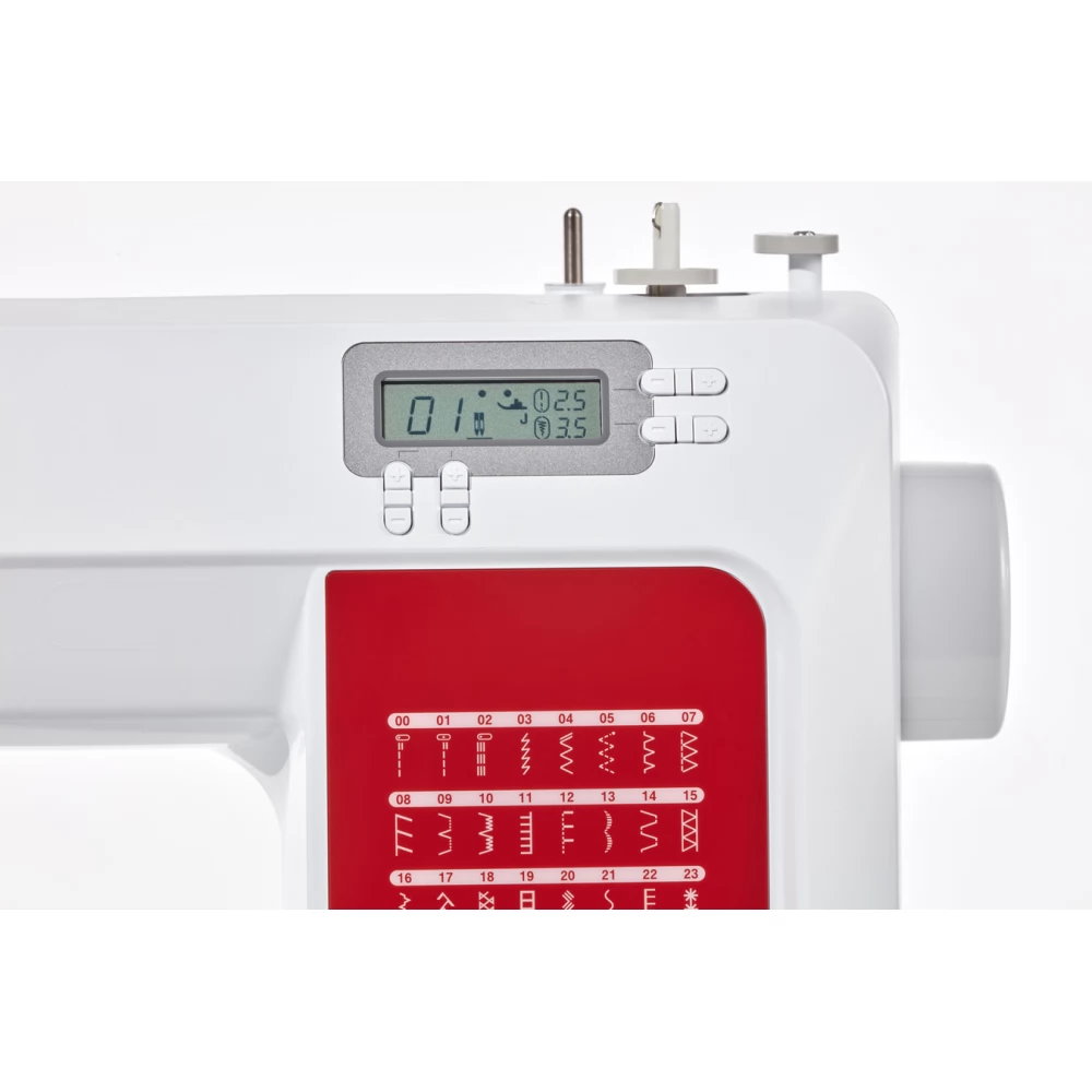 - LCD kijelző a varrás közben beállított paraméterek egyszerű megjelenítéséhez