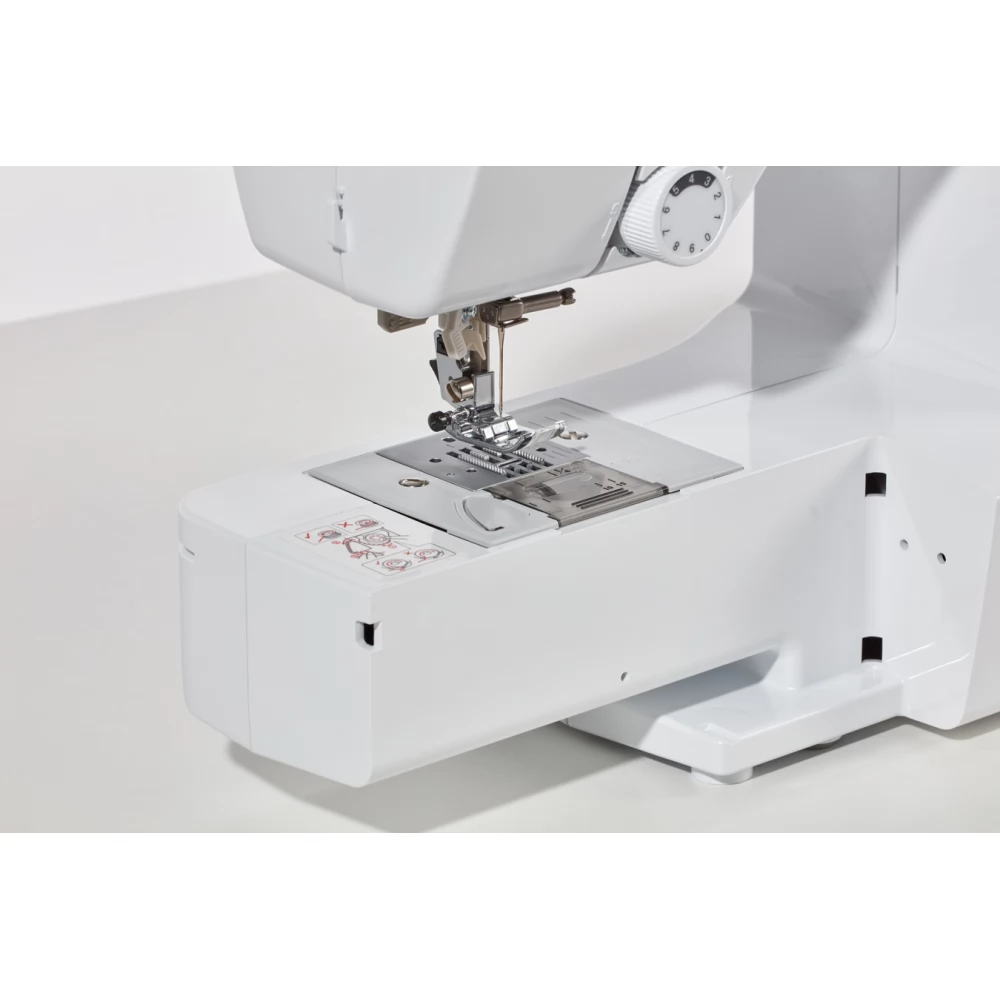 - Munkalap levehető karral a kart eltávolítják, ha hengeres darabokat (ujj, nadrágszár) szeretne varrni, a levehető kar egyben rekesz funkciót is ellát a tartozékok számára