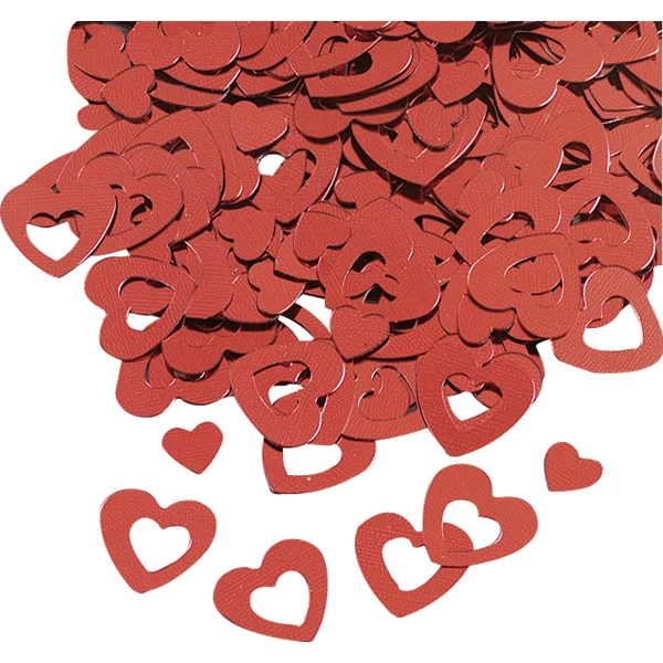 Csillogó, műanyag dekor szívecskék. Piros színben, 20 grammos csomagban. Mérete 15 és 7 mm.