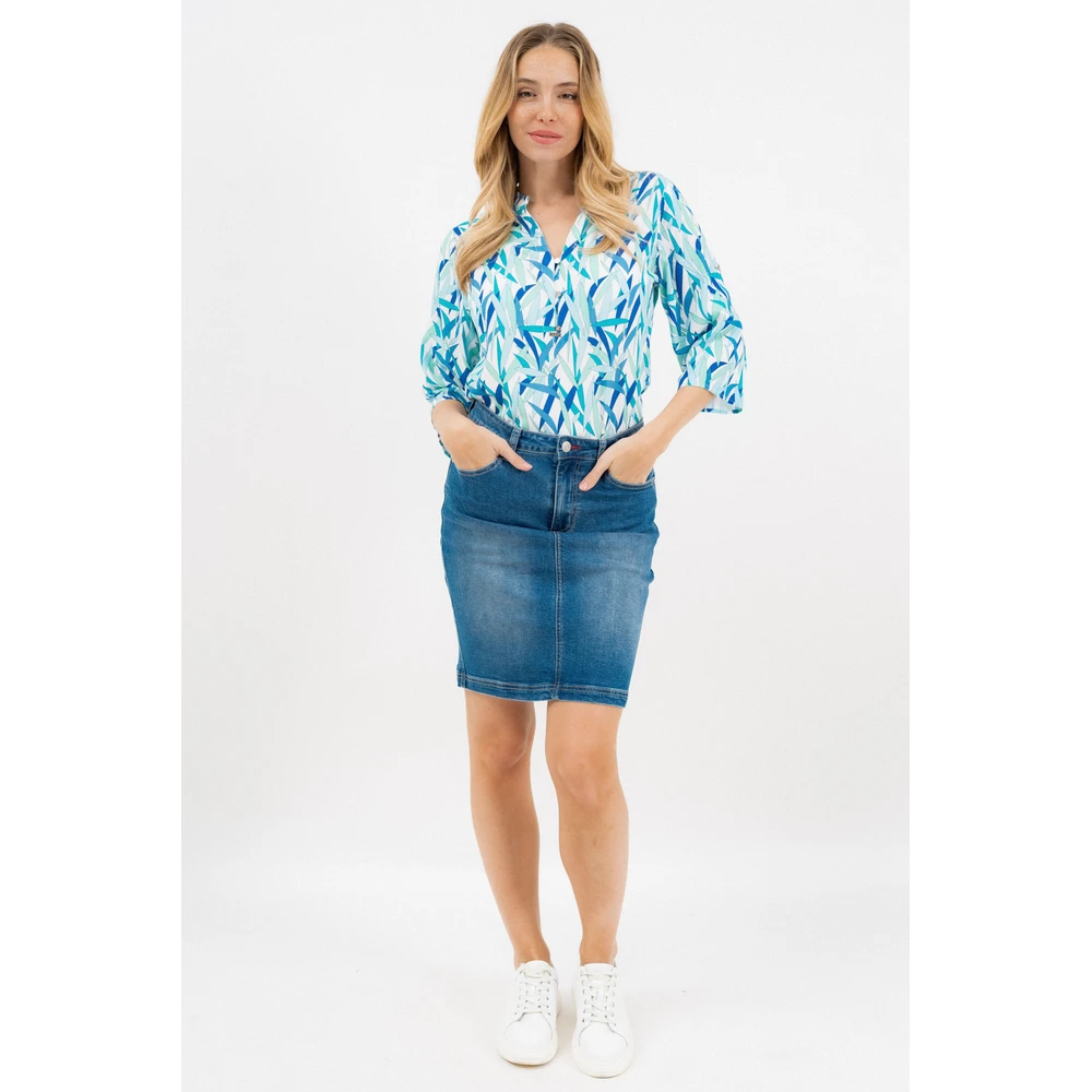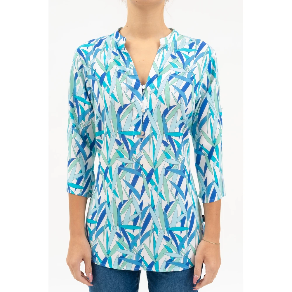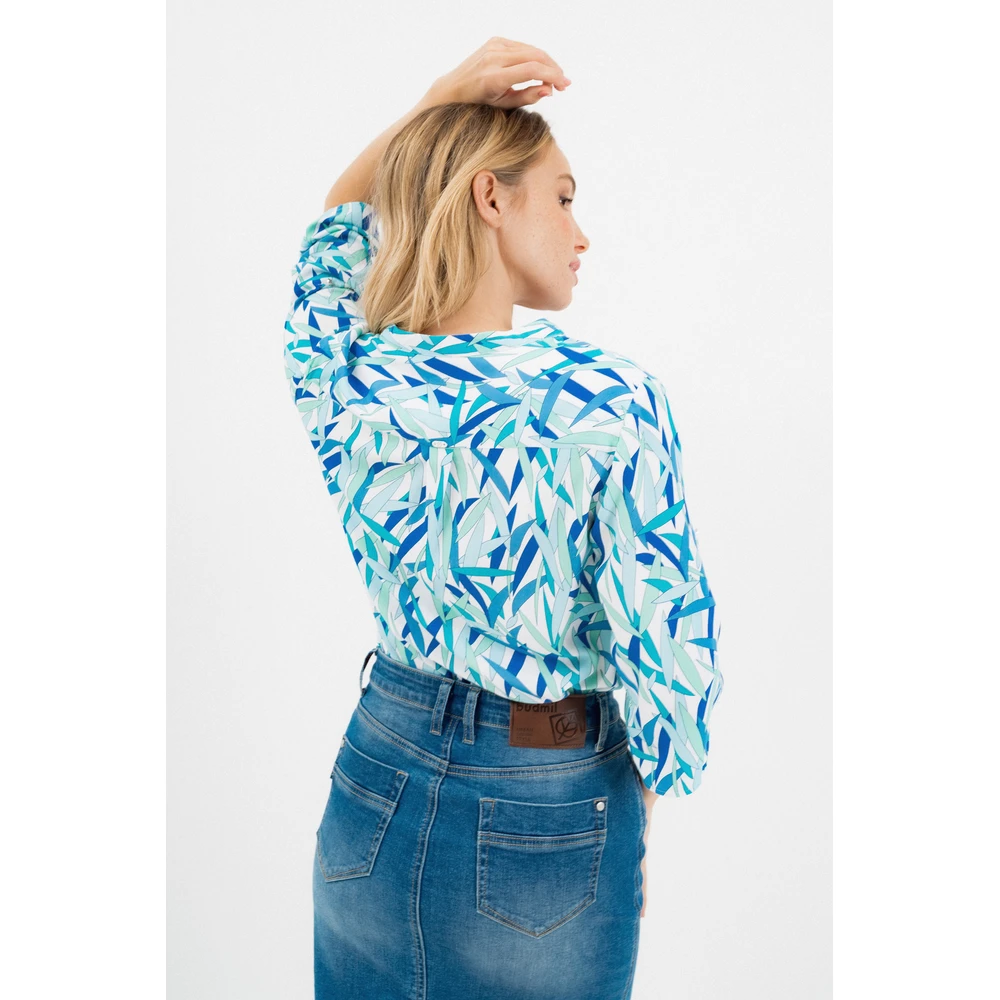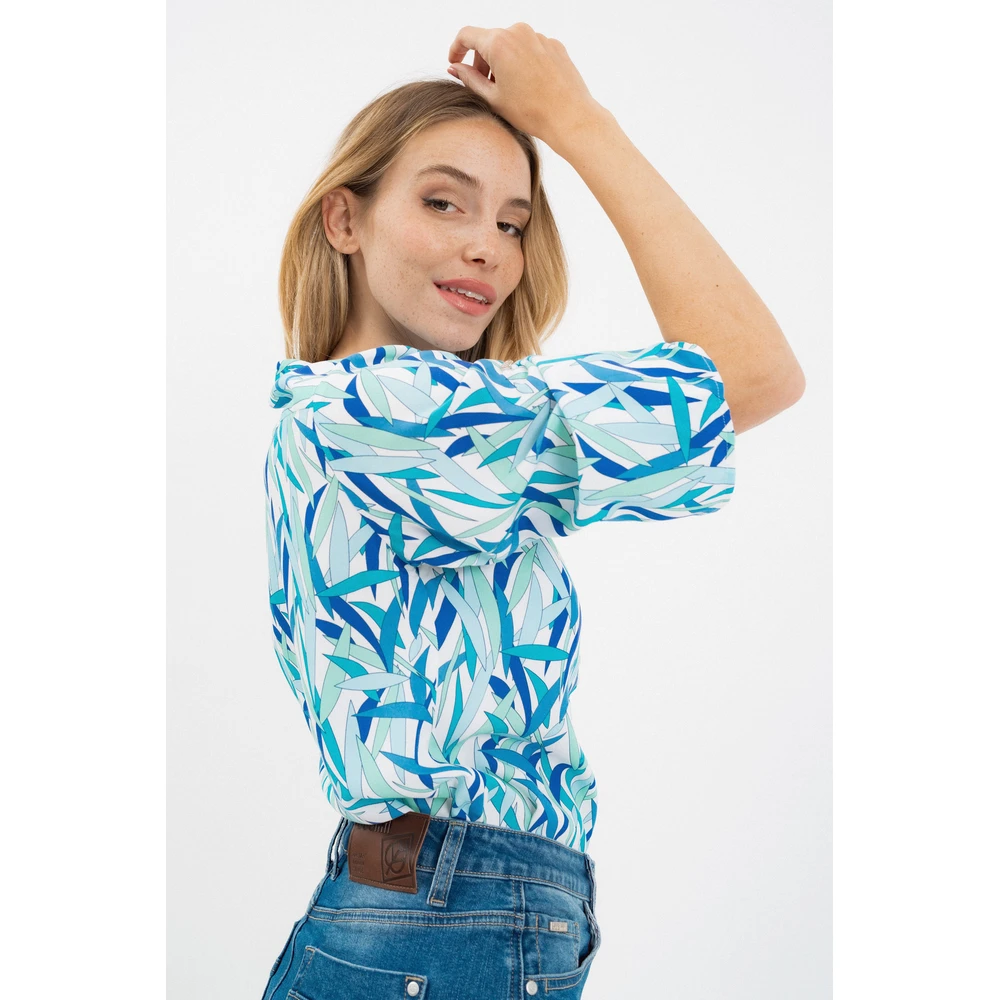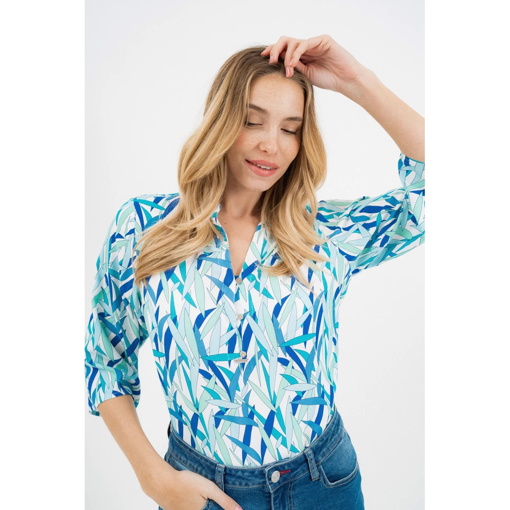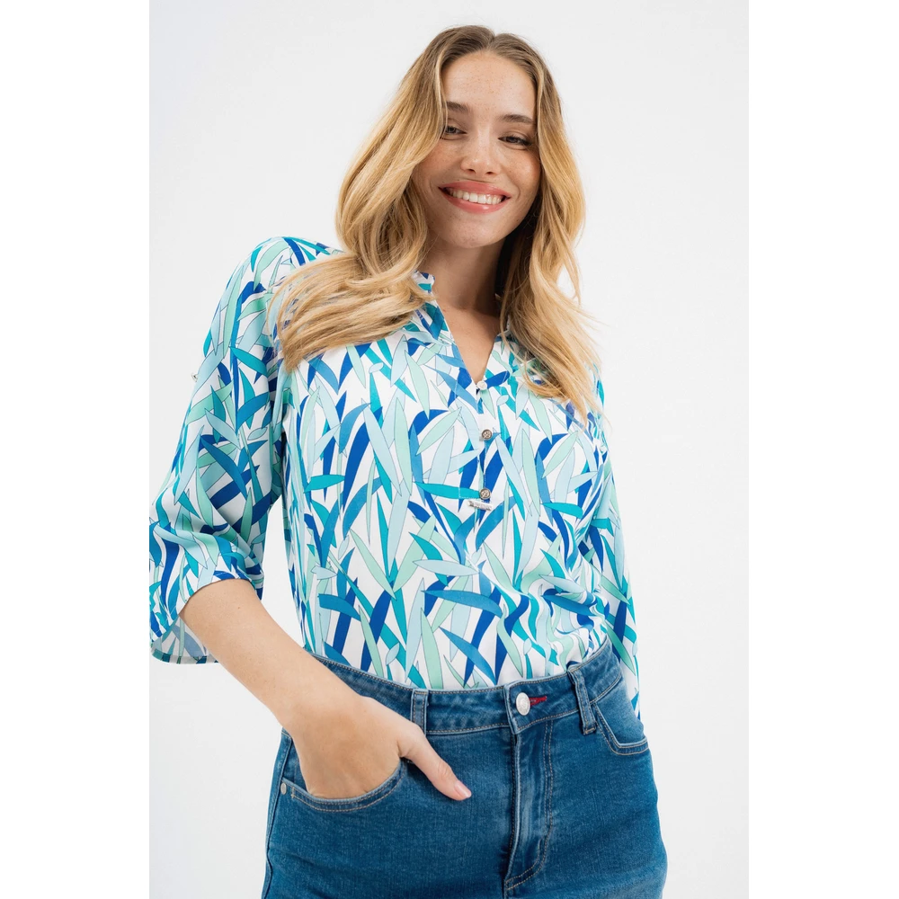 Ez a 3/4-es ujjú női blúz praktikus és kényelmes viseletet biztosít a mindennapokra. Az enyhén karcsúsított fazon nőies sziluettet nyújt, míg az ujjak alján elhelyezett felgombolható rész lehetővé teszi a fazon igény szerinti beállítását.