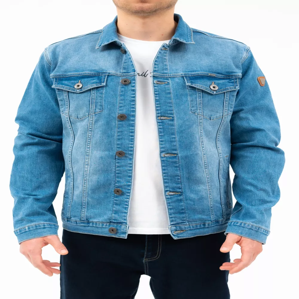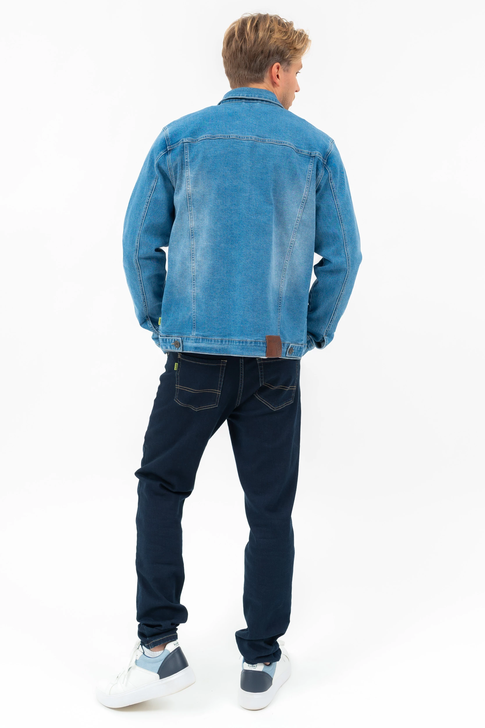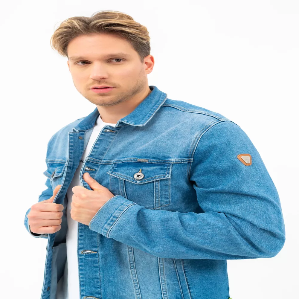 férfi farmerdzseki fém és műbőr címkével díszítve