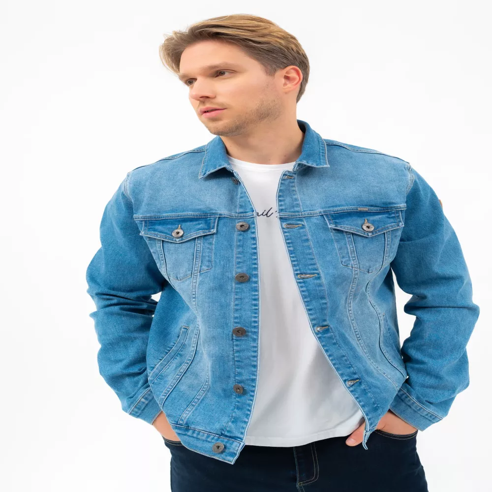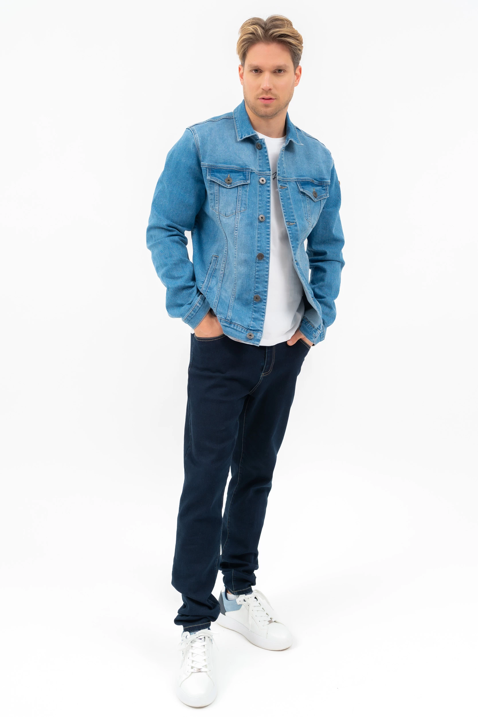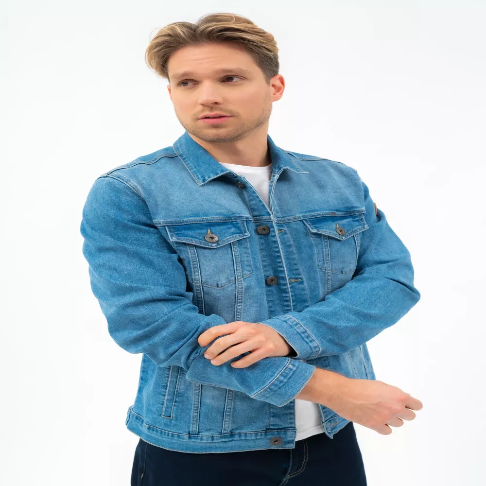 férfi farmerdzseki fém és műbőr címkével díszítve