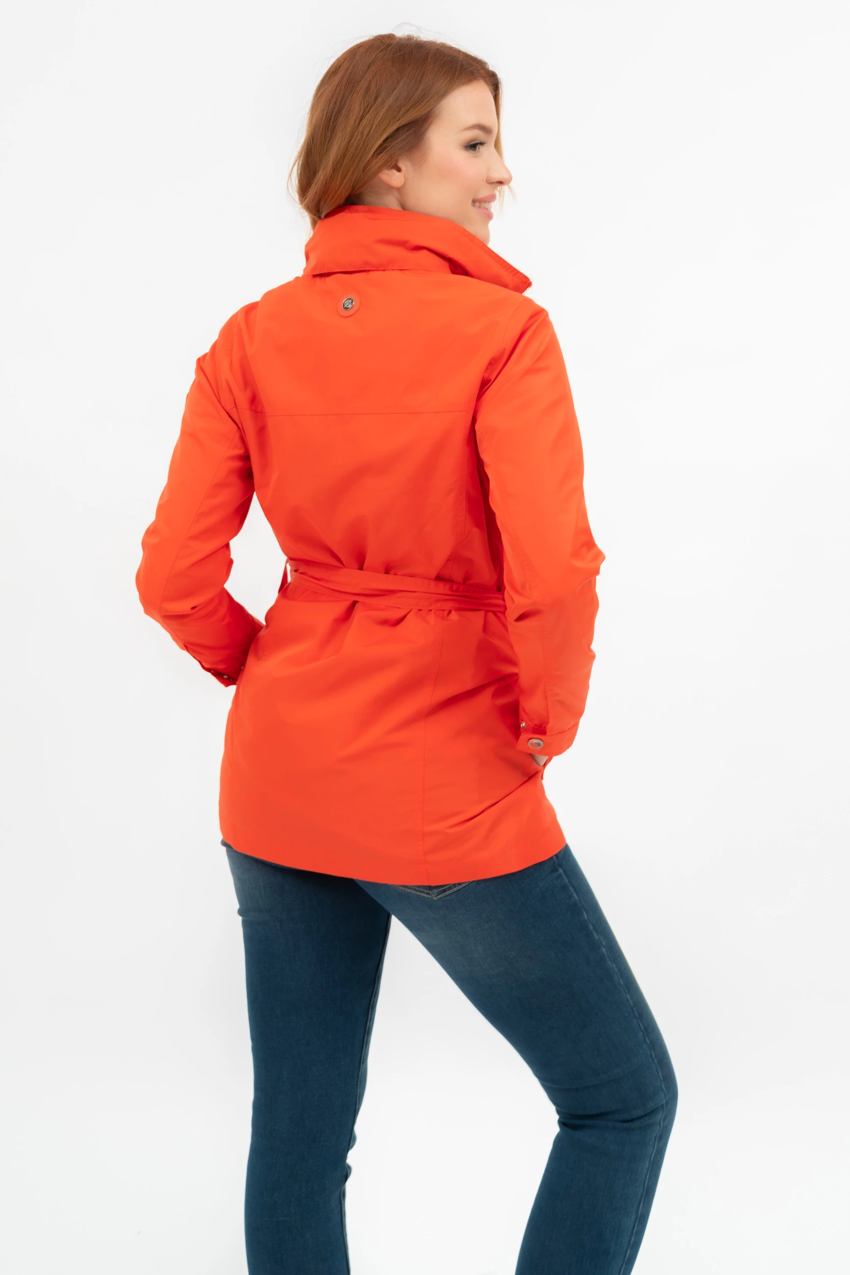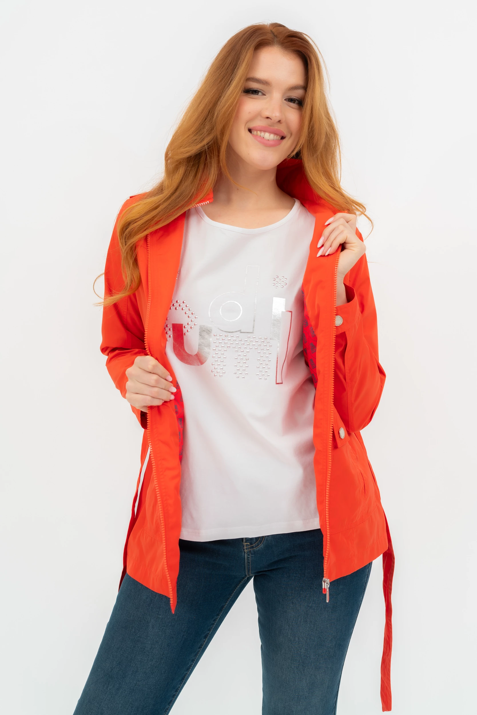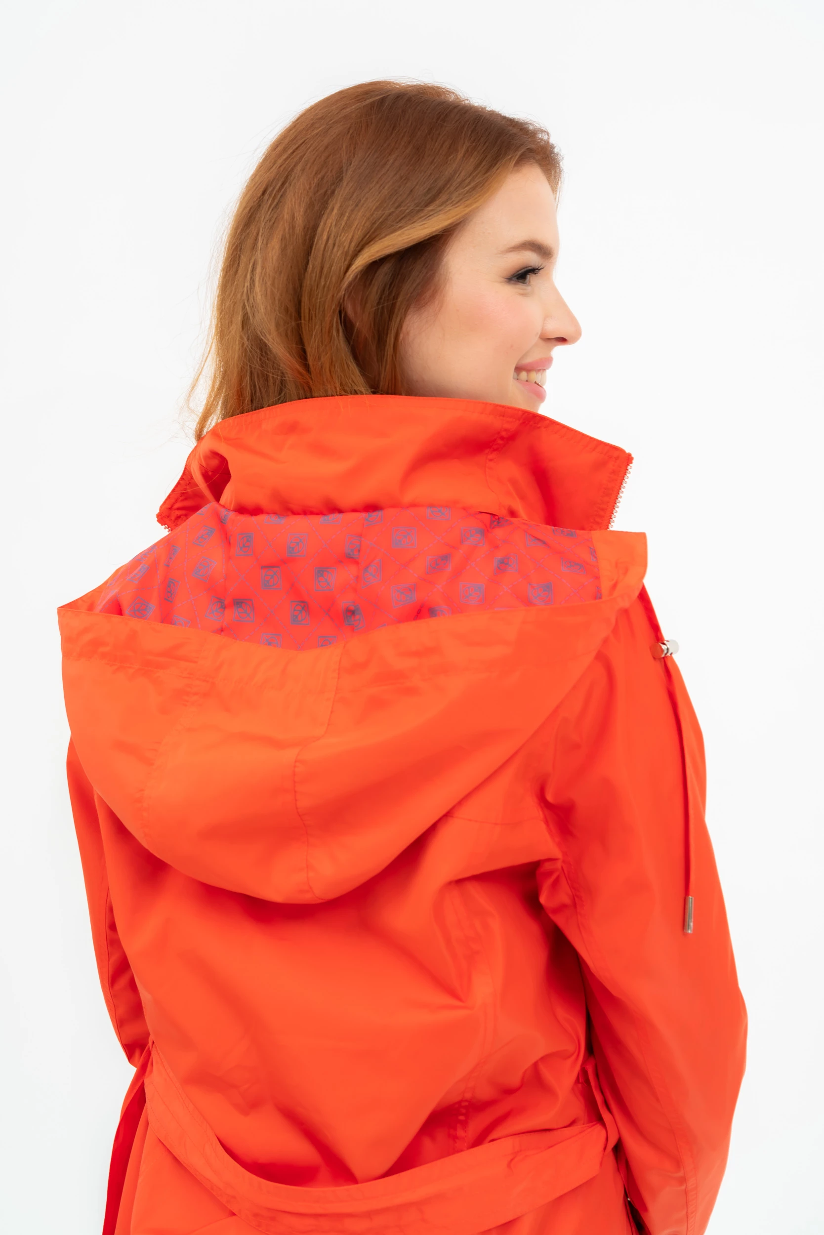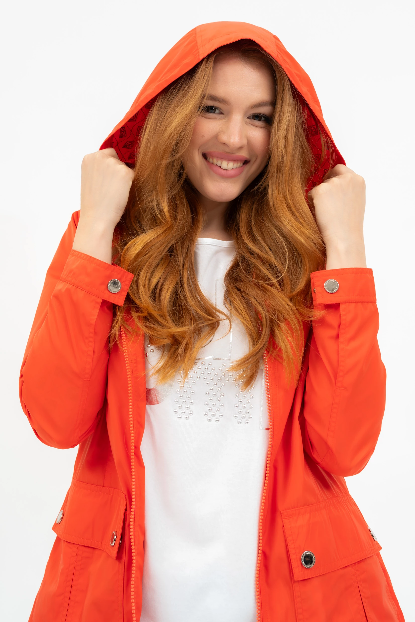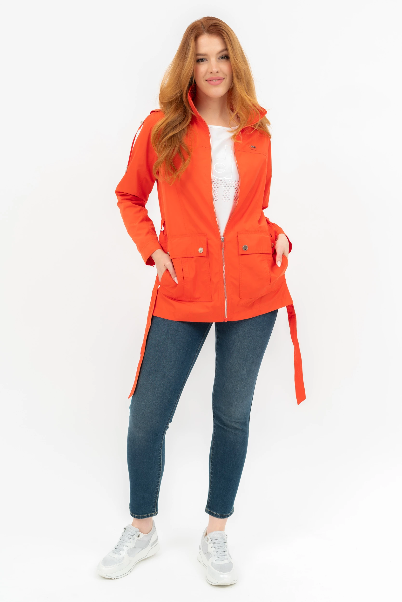 női dzseki hosszított fazonderekán övvelkapucni a gallérban fémcímkével díszítve