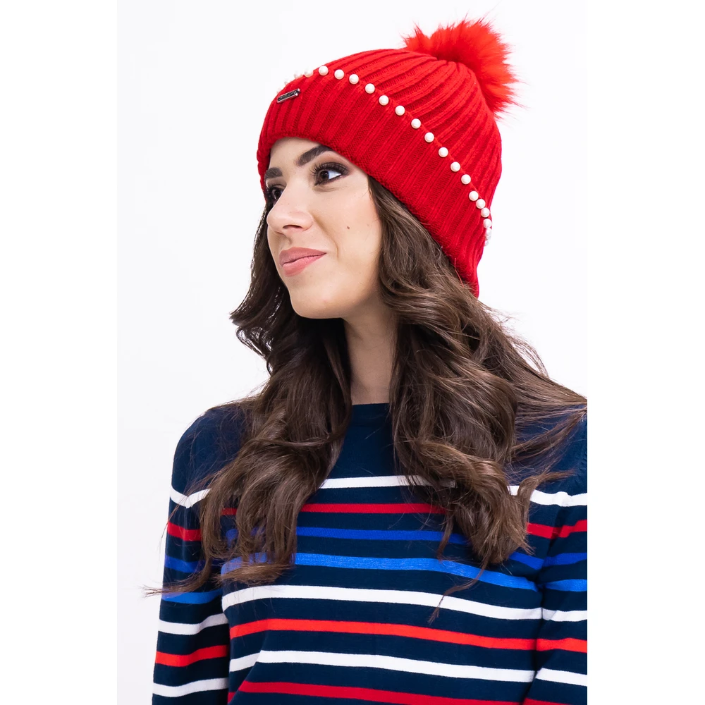 női kötött sapka műszőrme pom-pommalvékony polár bélésselalja visszahajthatógyöngyökkel és fémcímkével díszített
