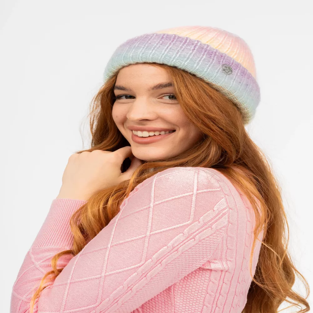 női kötött színátmenetes sapkaalja visszahajthatófémcímkével díszítve