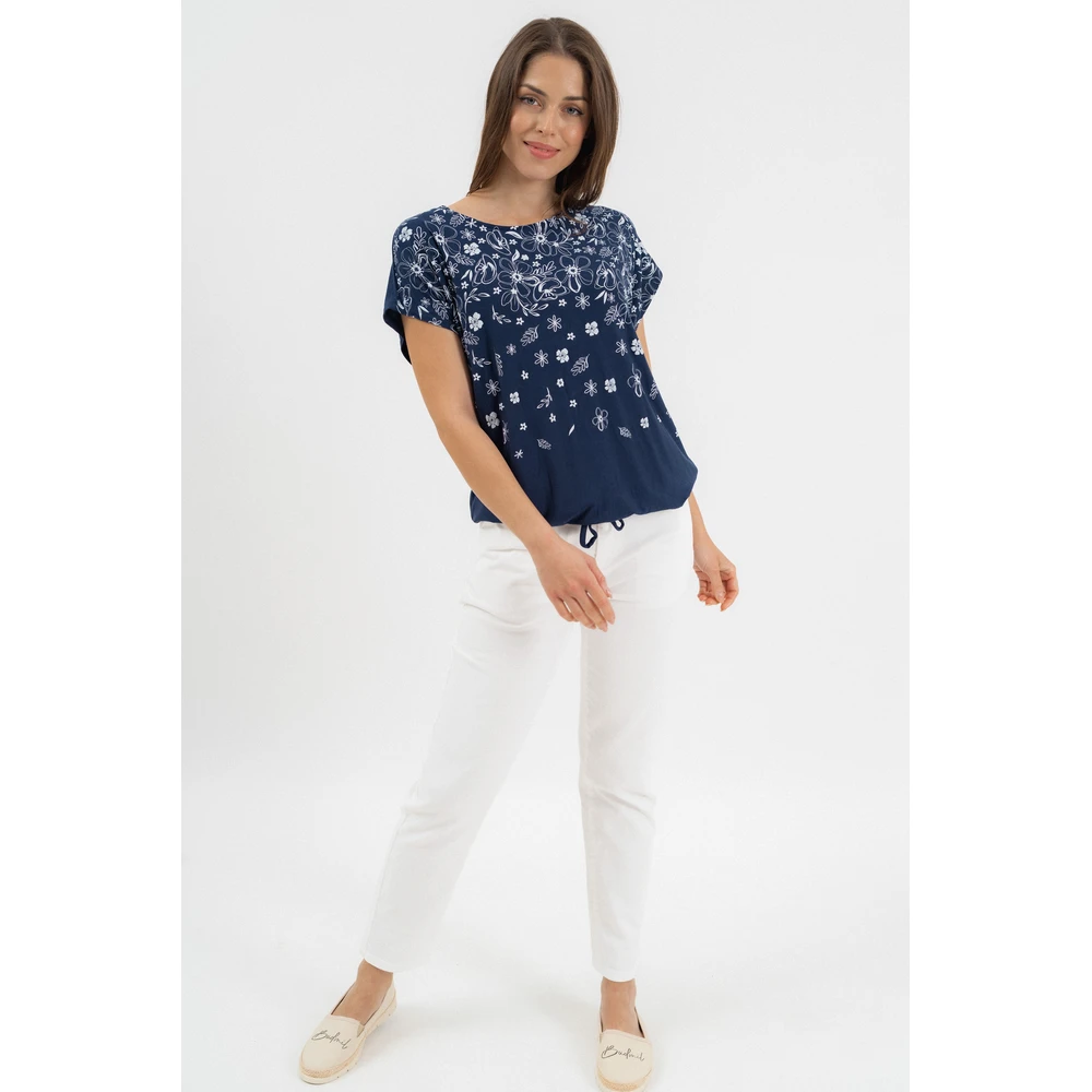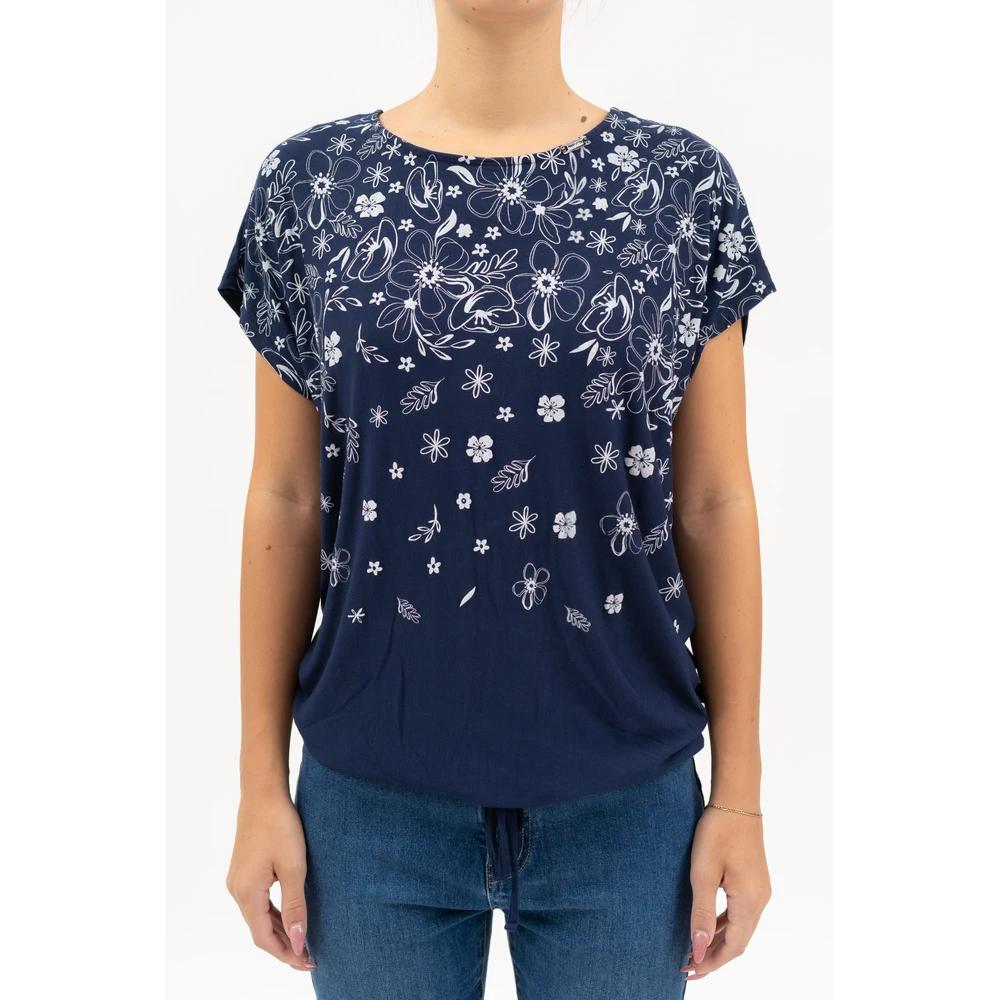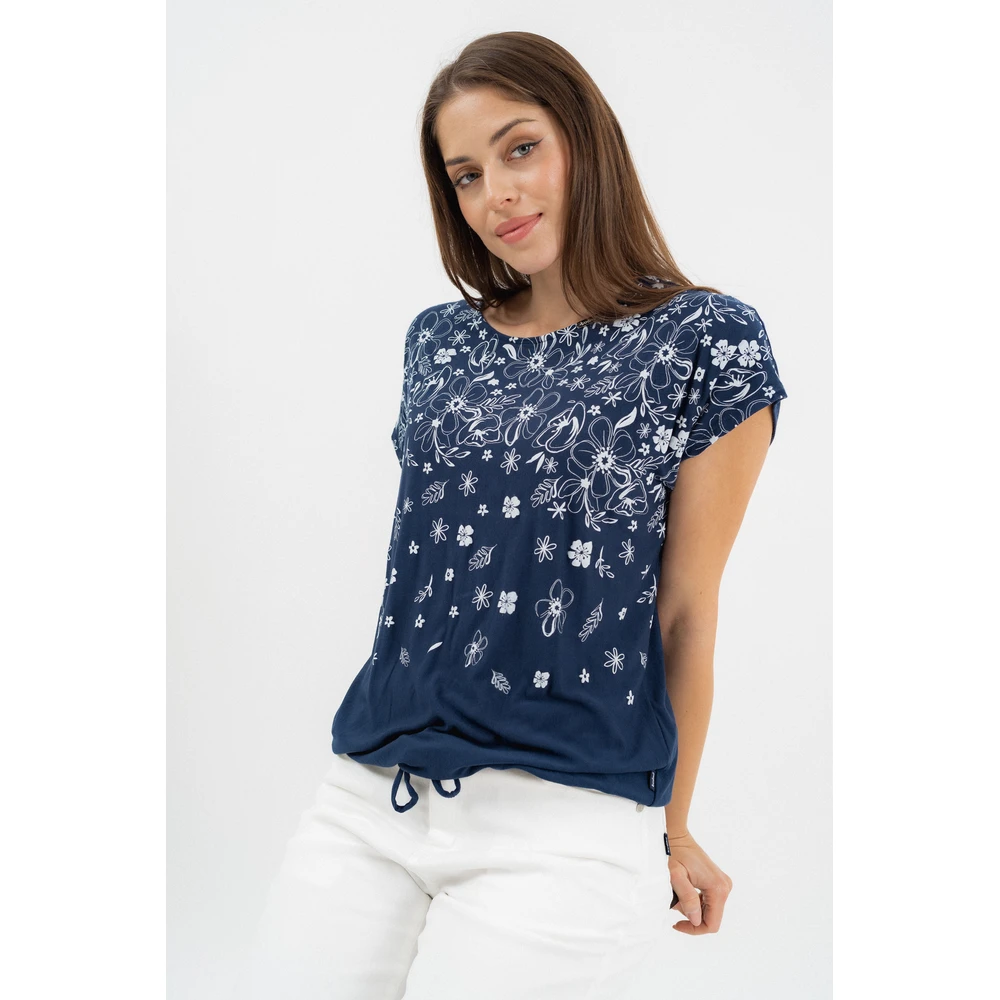 A póló alját gumis szegély zárja, amely egy pánttal tetszés szerint összehúzható, így egyedi, formás sziluettet kölcsönöz a deréknál. Az elején nagy, nyomott minta díszíti, amely játékos és trendi megjelenést biztosít.