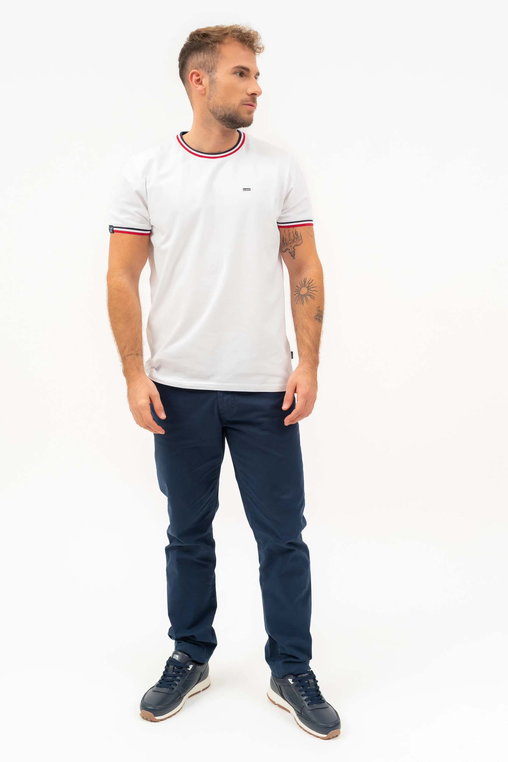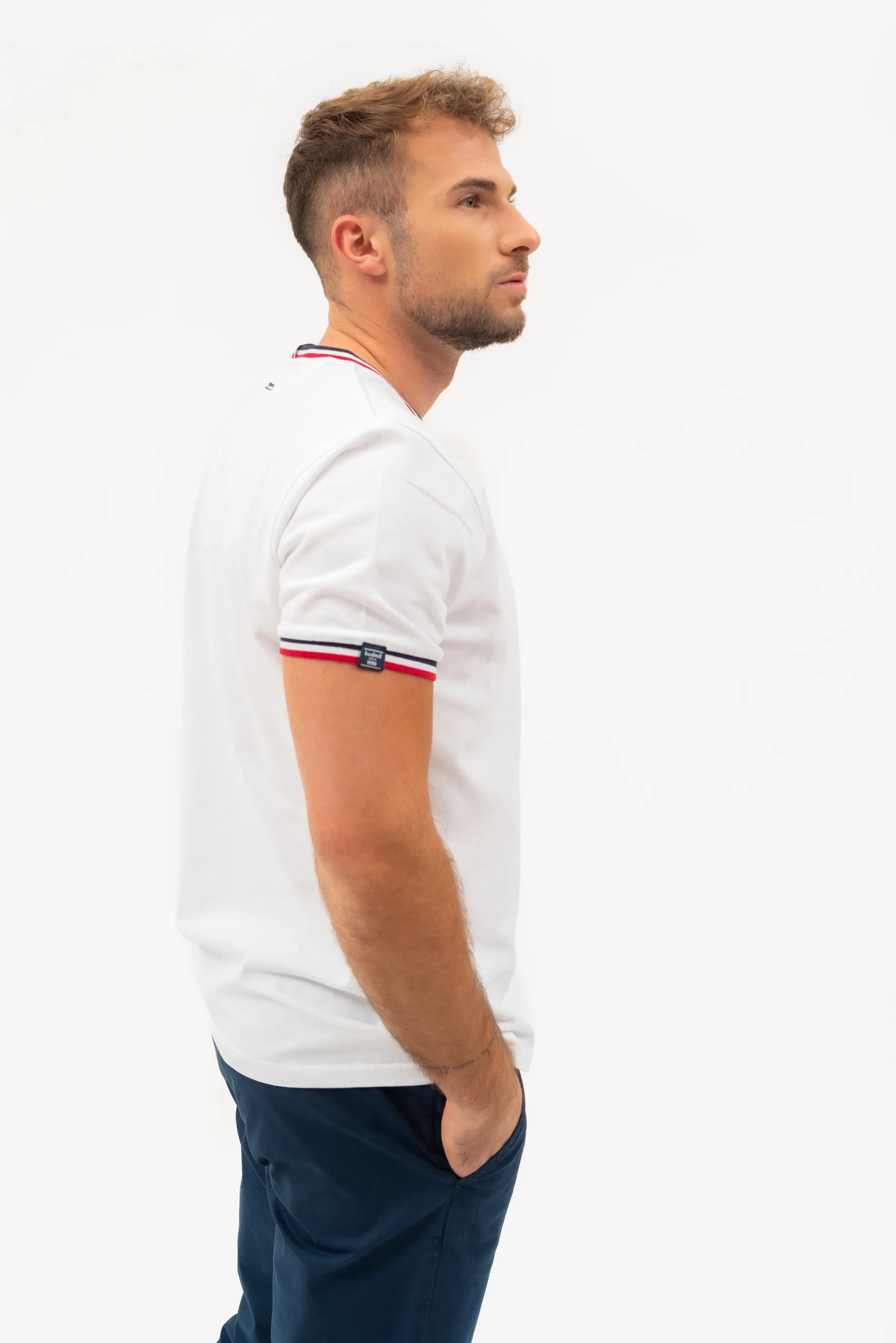 modern fit férfi póló rugalmas piké anyagbólnyomott mintával és szövött címkével díszített