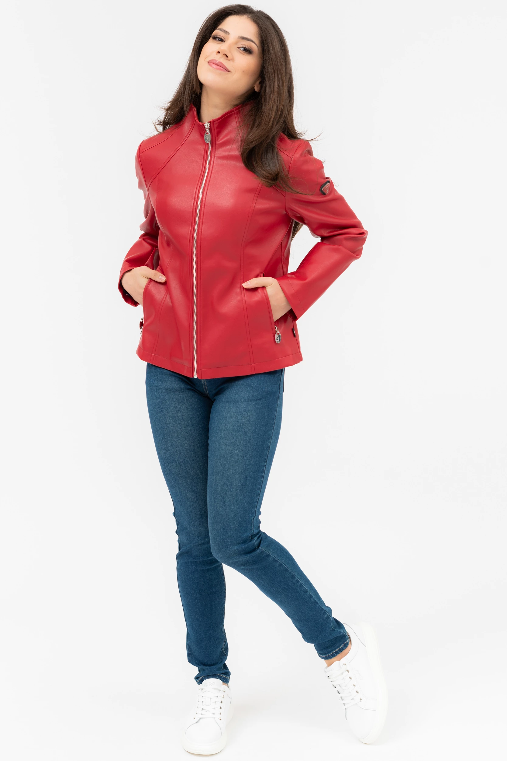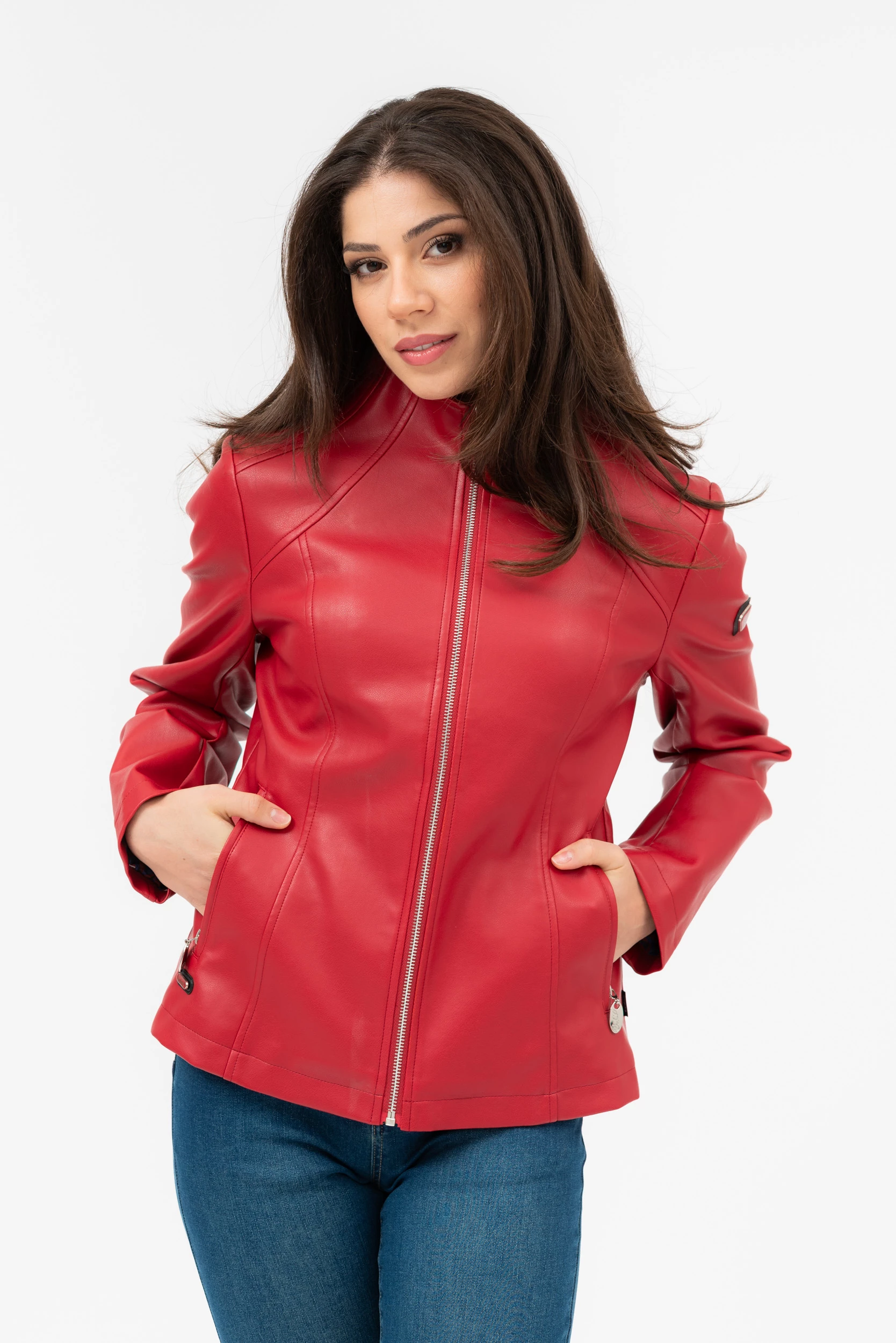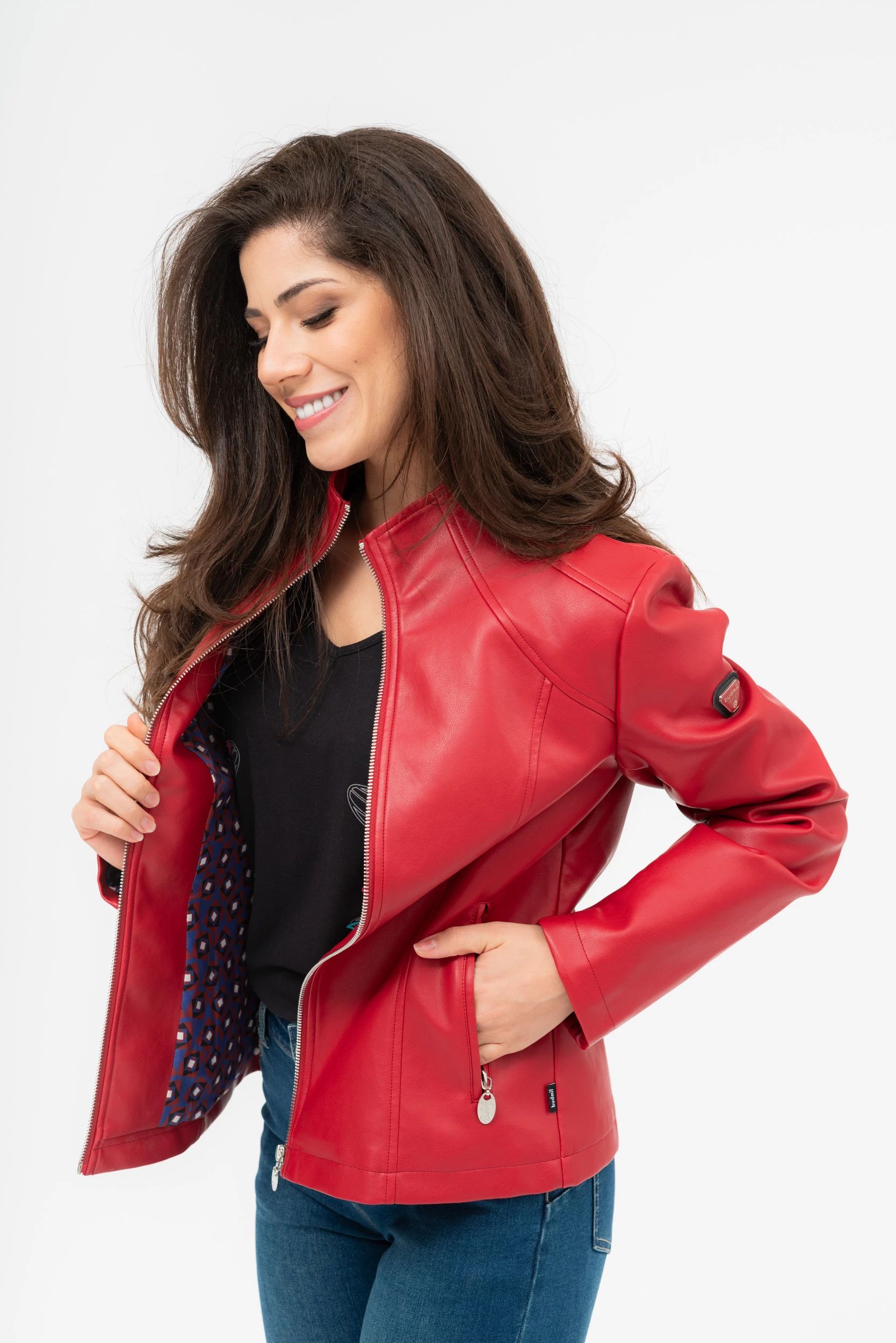 női műbőr dzsekikarcsúsított fazonfémcímkével díszítve
