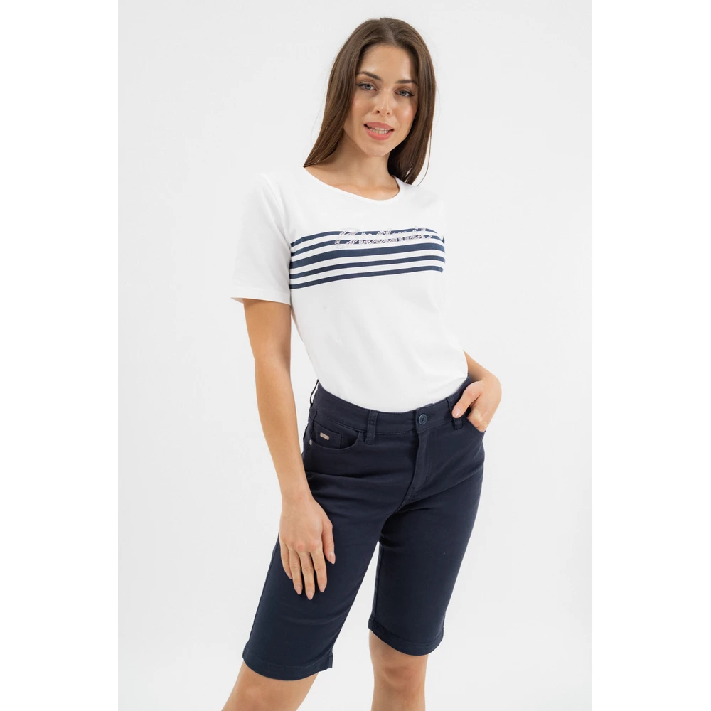 Ez a női bermuda nadrág szövött vászon anyagból készült, amely kényelmes és stílusos darab a melegebb napokra. Az anyag 97% pamutot és 3% elasztánt tartalmaz, így rugalmas és kellemes viseletet biztosít....