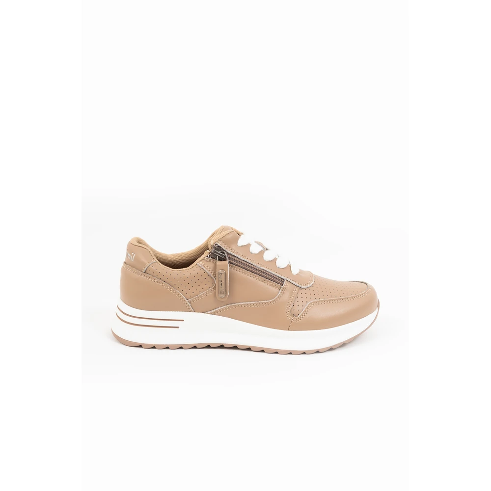 A cipőt nyomott minta és elegáns fémcímke díszíti, amely modern, feltűnő részletként emeli ki a sneaker karakterét. A bézs színválasztás sokoldalú, könnyen kombinálható különböző ruhadarabokkal.