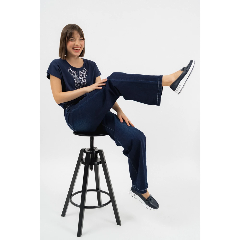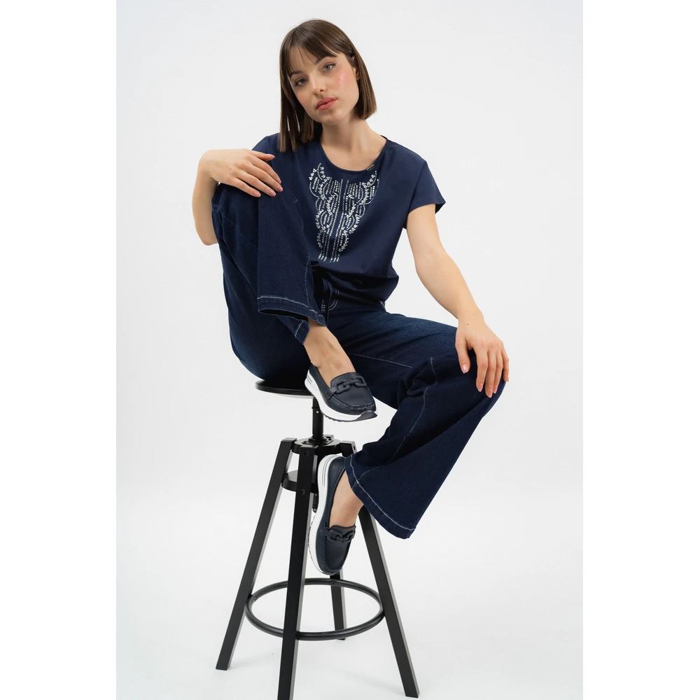 A nyomott mintával díszített felső rész stílusos, nőies részletként teszi egyedivé ezt a mokaszint. Az elegáns sötétkék szín sokoldalúan kombinálható különféle öltözetekkel.