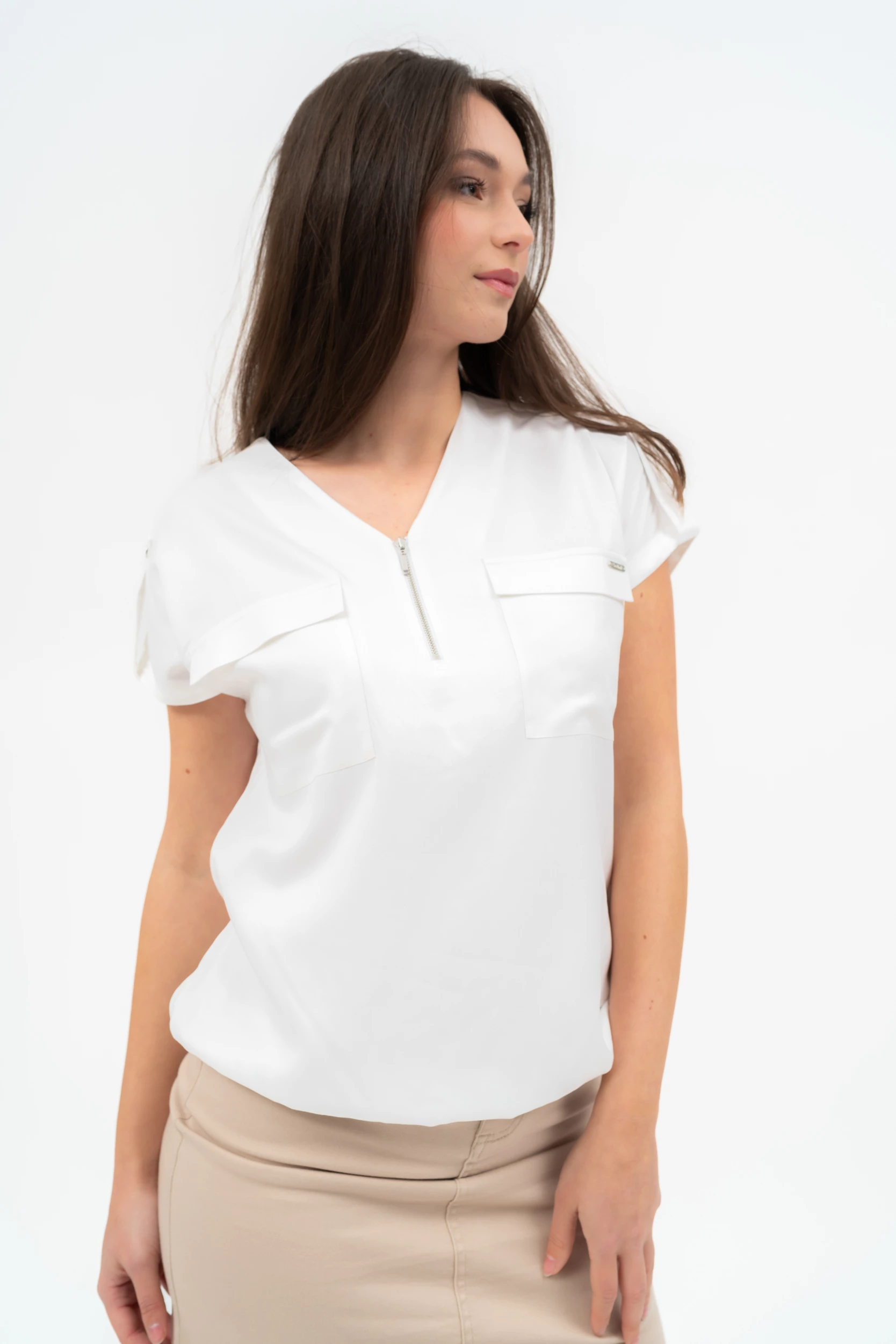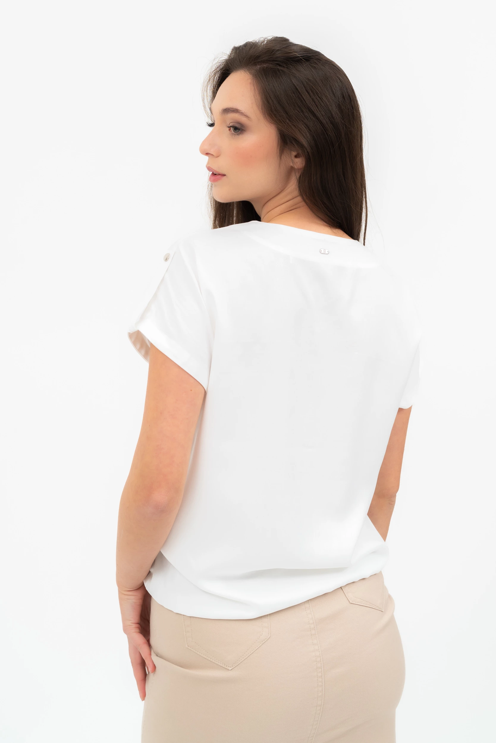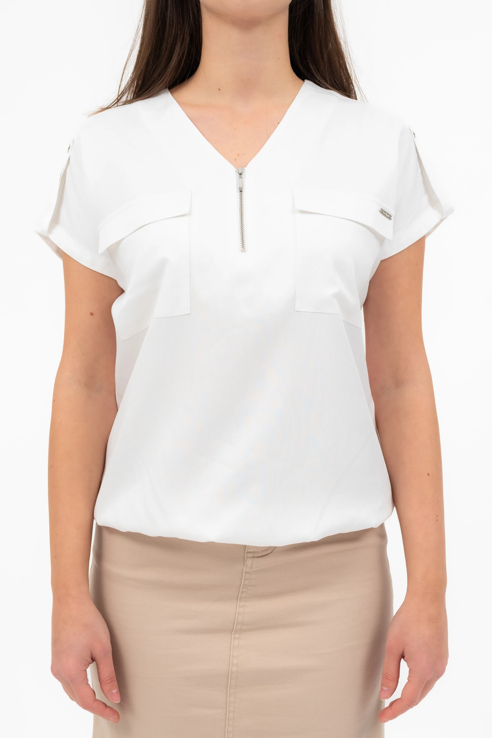 rövid ujjú női blúz lezser fazon alján gumírozottfémcímkével díszítve
