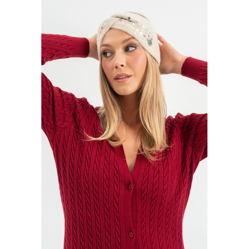 Elegáns női kötött fejpánt, amely tökéletes kiegészítője lehet mindennapi vagy alkalmi viseletének. A strasszokkal és fémcímkével díszített fejpánt egyedi stílust kölcsönöz megjelenésének.