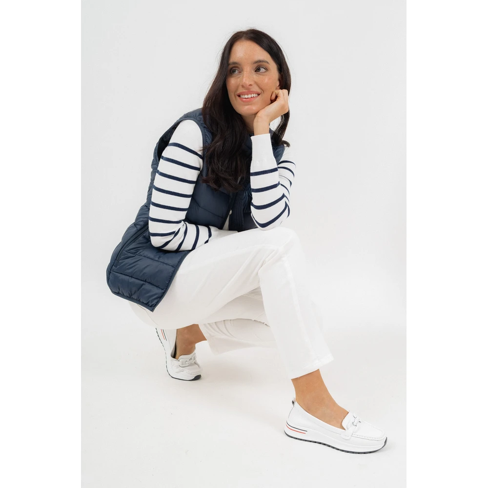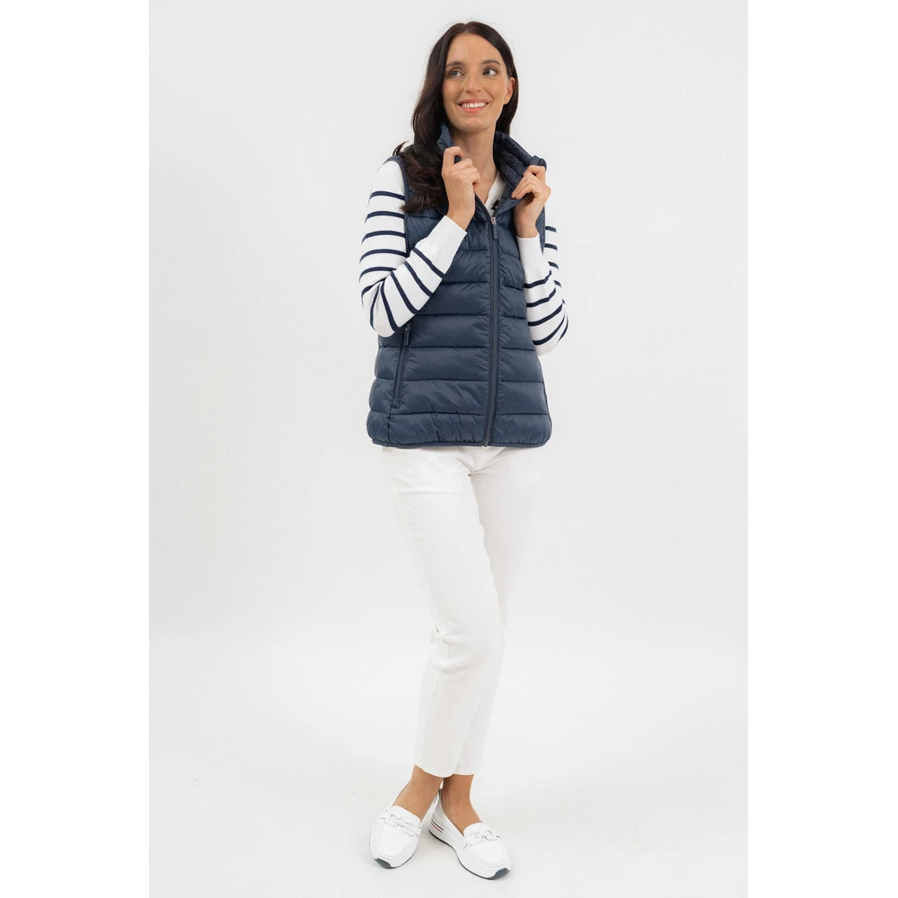 Ez a női steppelt vékony mellény praktikus és stílusos választás az átmeneti időszakra. A vízlepergető anyag védelmet nyújt a kisebb eső és a szél ellen, míg az enyhén karcsúsított fazon nőies sziluettet biztosít.