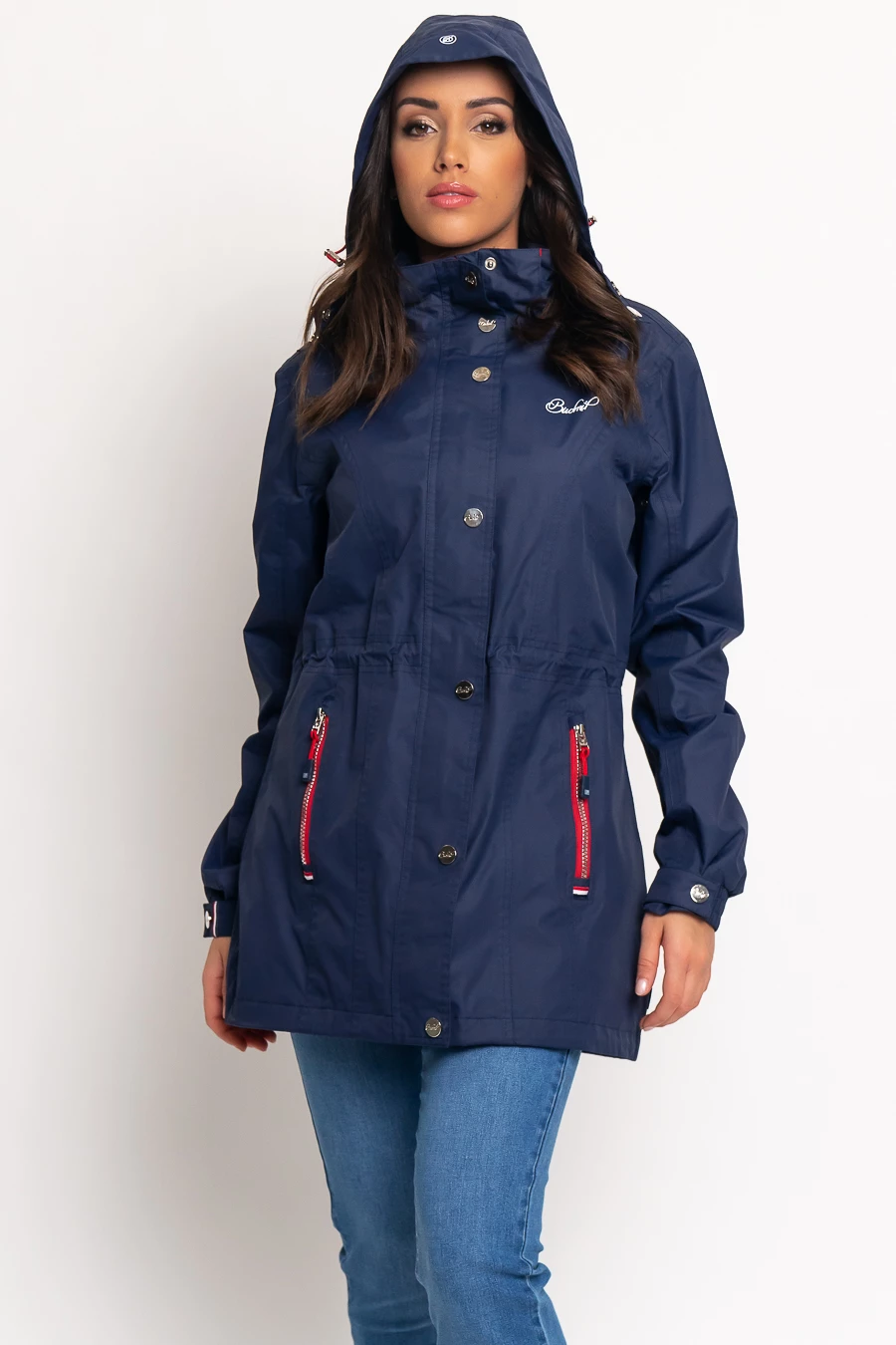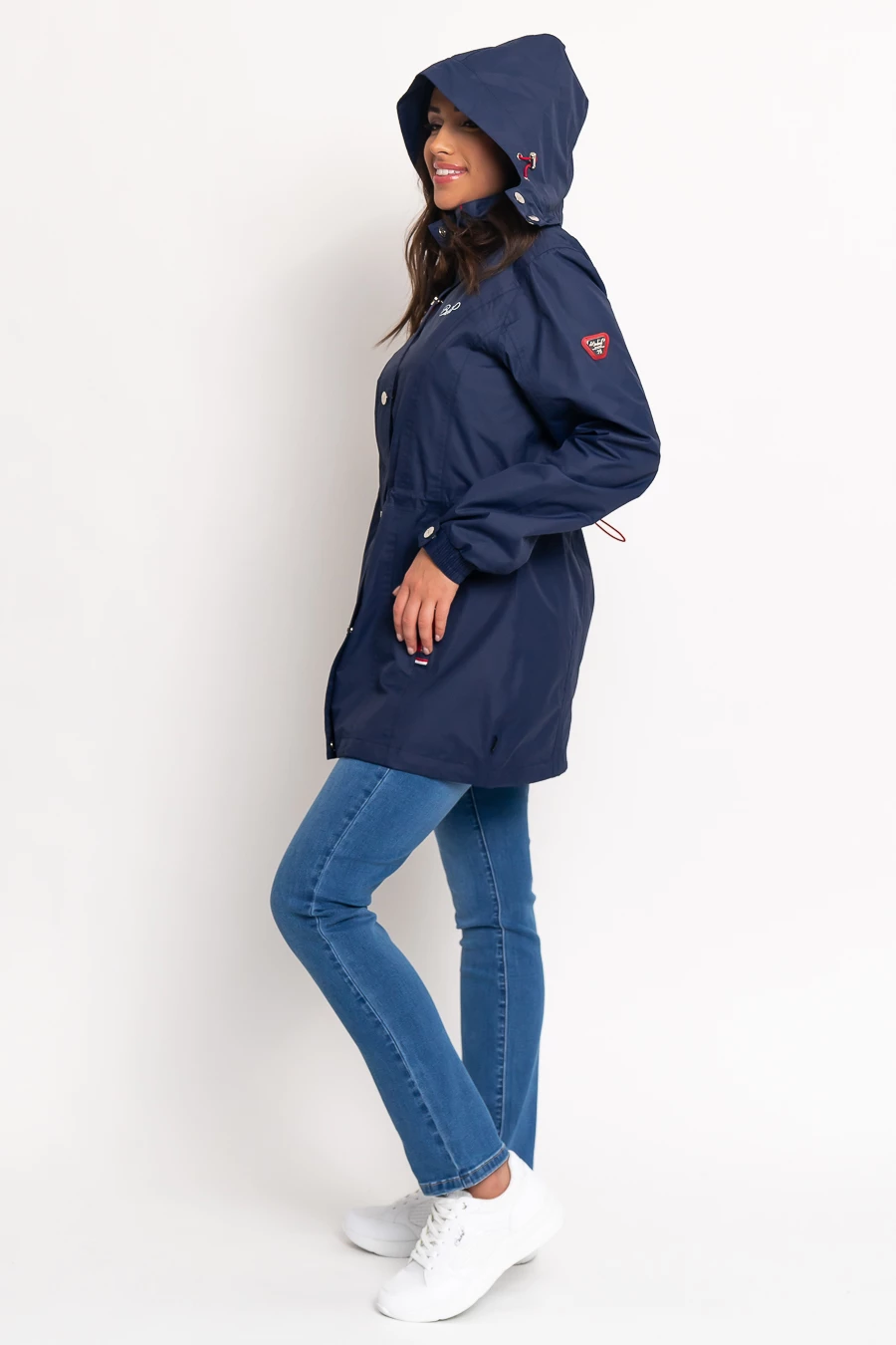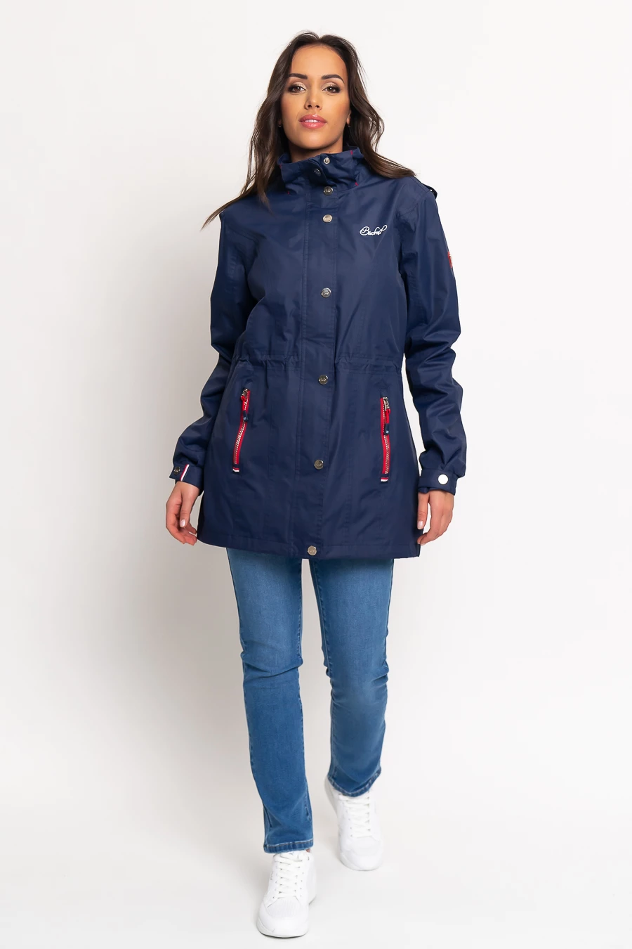 női széldzseki vízálló és lélegző anyagból100% poliészter hálós bélésselvízálló, hegesztett varratokkalkapucnija lecipzározhatónyomott mintával és fémcímkével díszített