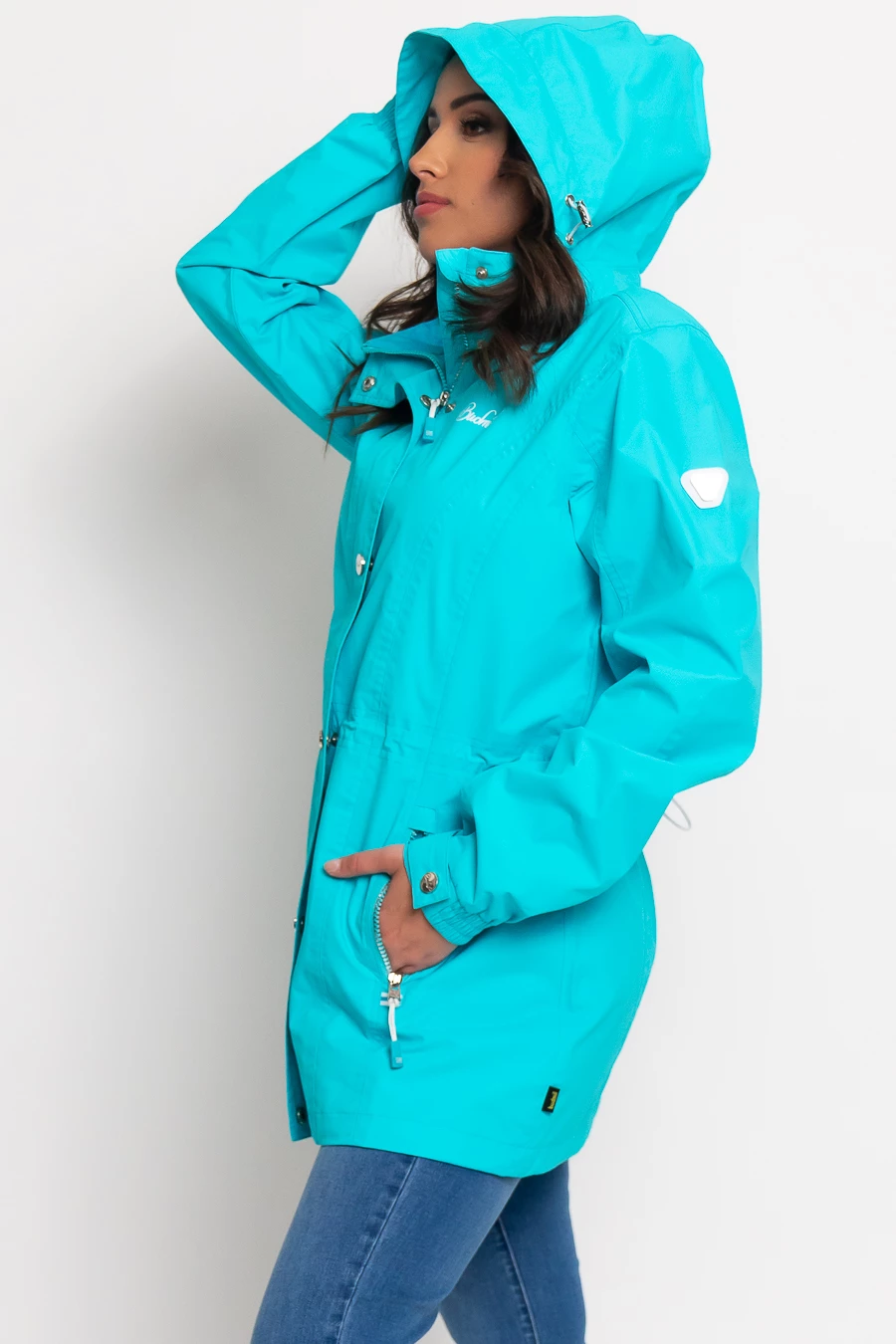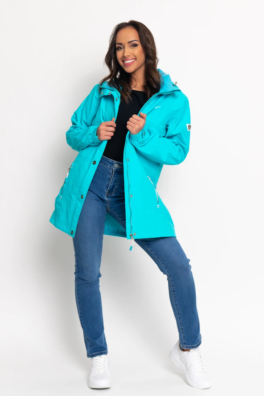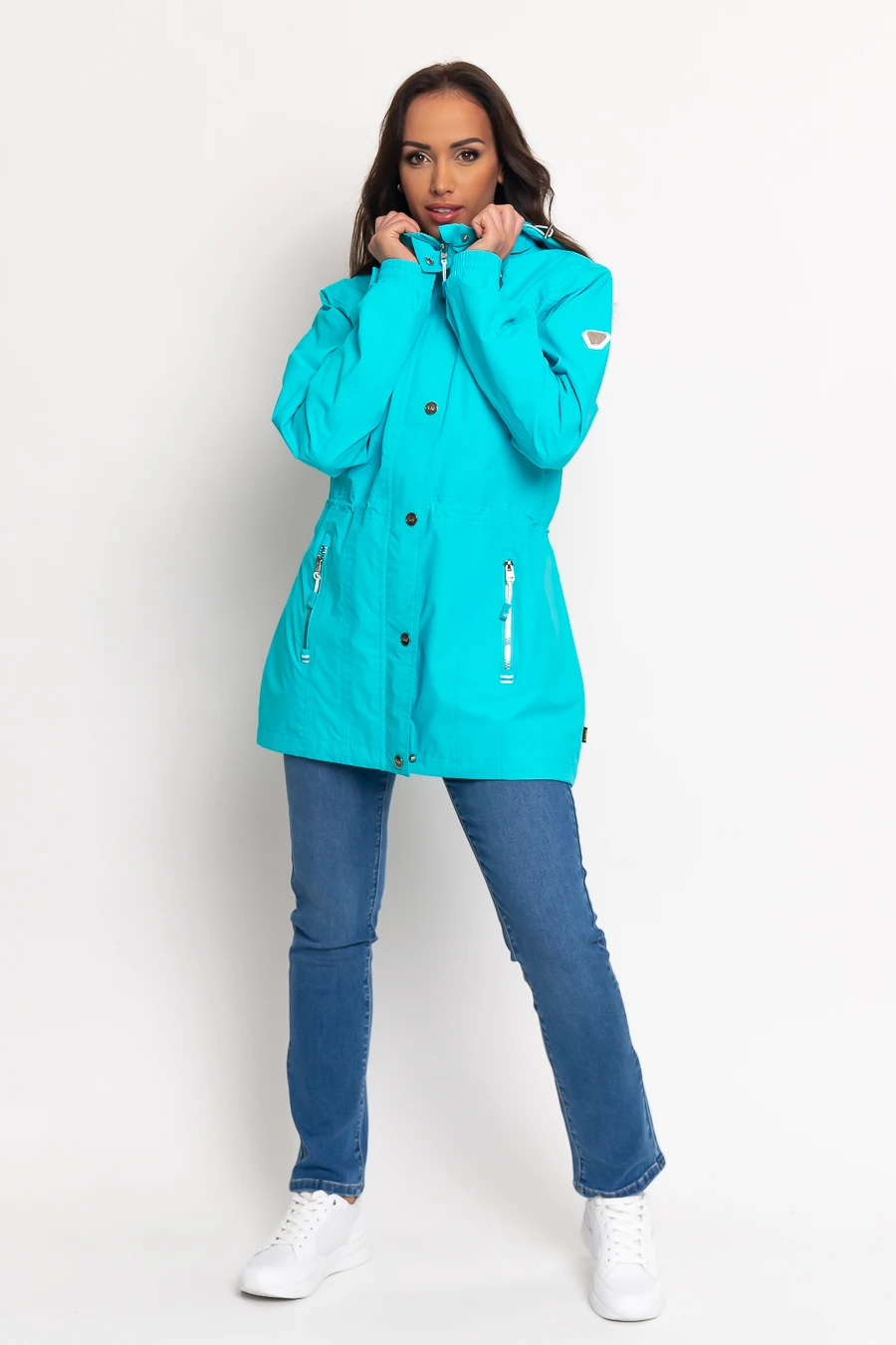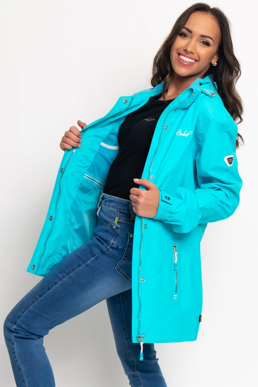 női széldzseki vízálló és lélegző anyagból100% poliészter hálós bélésselvízálló, hegesztett varratokkalkapucnija lecipzározhatónyomott mintával és fémcímkével díszített